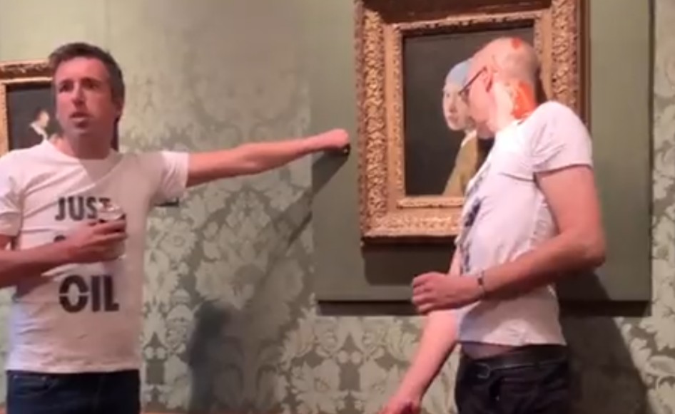 莫瑞泰斯皇家美術館發言人表示,約下午2時,有2人將自己黏在韋梅爾(Johannes Vermeer)的畫作「戴珍珠耳環的少女」(Girl with a Pearl Earring)。畫作外層有玻璃,其中一人將自己的頭黏在畫上的玻璃,另一人將自己的手黏在牆上,有第3人將不明物質扔向畫作。