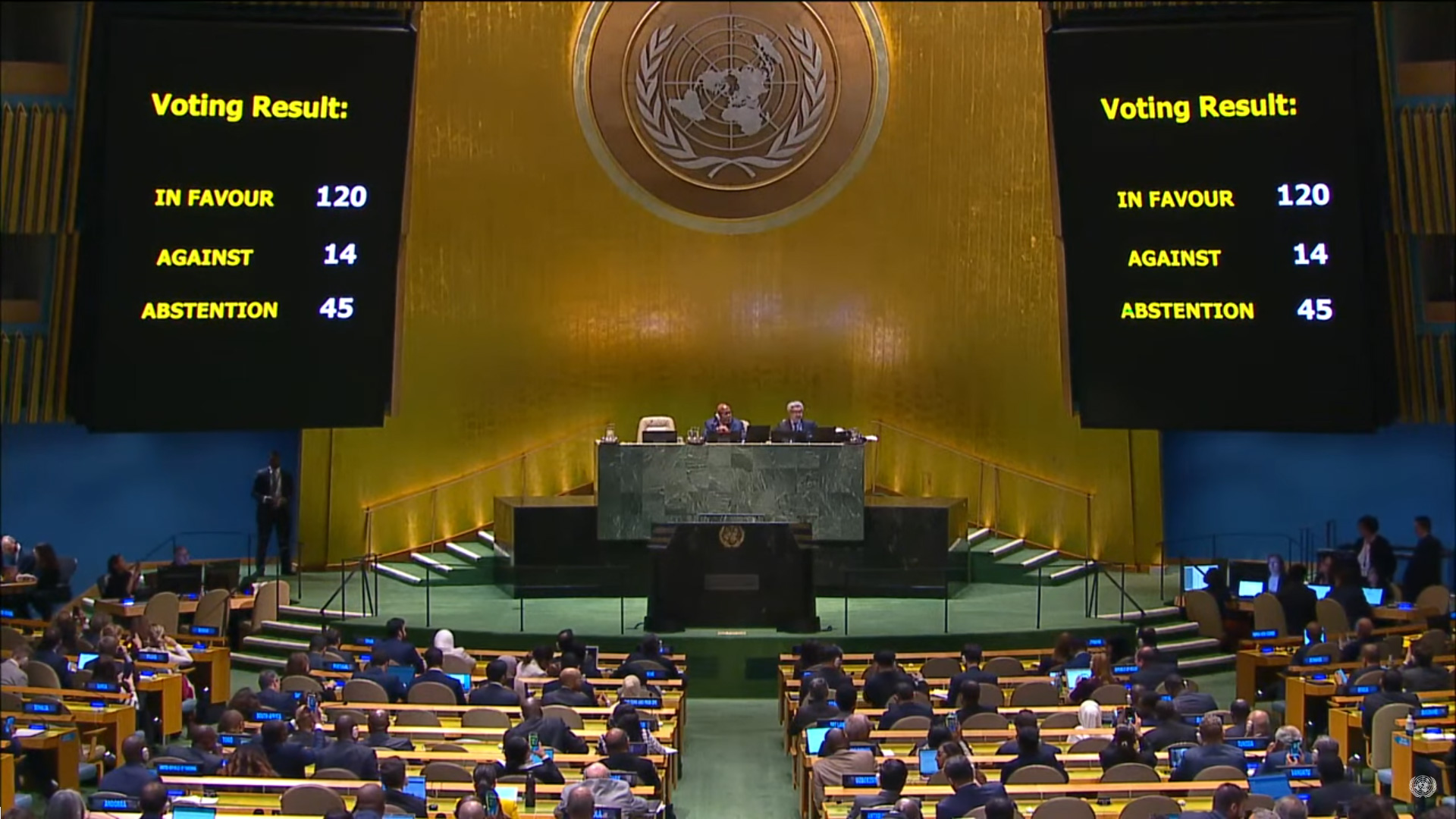 決議以120票贊成、45票棄權、14票反對的表決結果,在一片掌聲中通過。伊拉克之後抱怨有技術性困難,然後將棄權票改為贊成票,因此最終計票結果為121票贊成、44票棄權。
