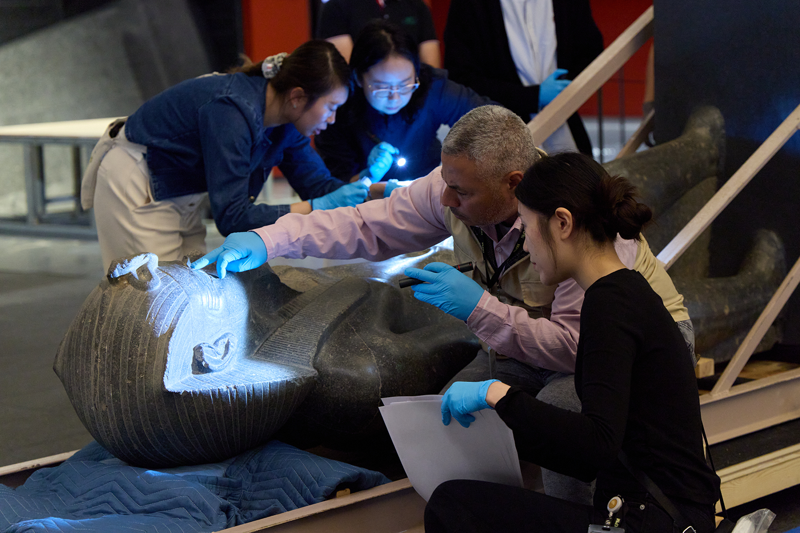 埃及駐香港及澳門總領事館副總領事Anas Shadi、香港故宮文化博物館館長吳志華博士,以及香港故宮文化博物館副館長(研究策展、藏品及節目)王伊悠博士率先見證法老麥倫普塔的邁步像(第19王朝,麥倫普塔統治時期,約公元前1213–公元前1203年在位)開箱。這尊高達2.4米、重逾1700公斤的巨型石像現已矗立於博物館地下大堂。