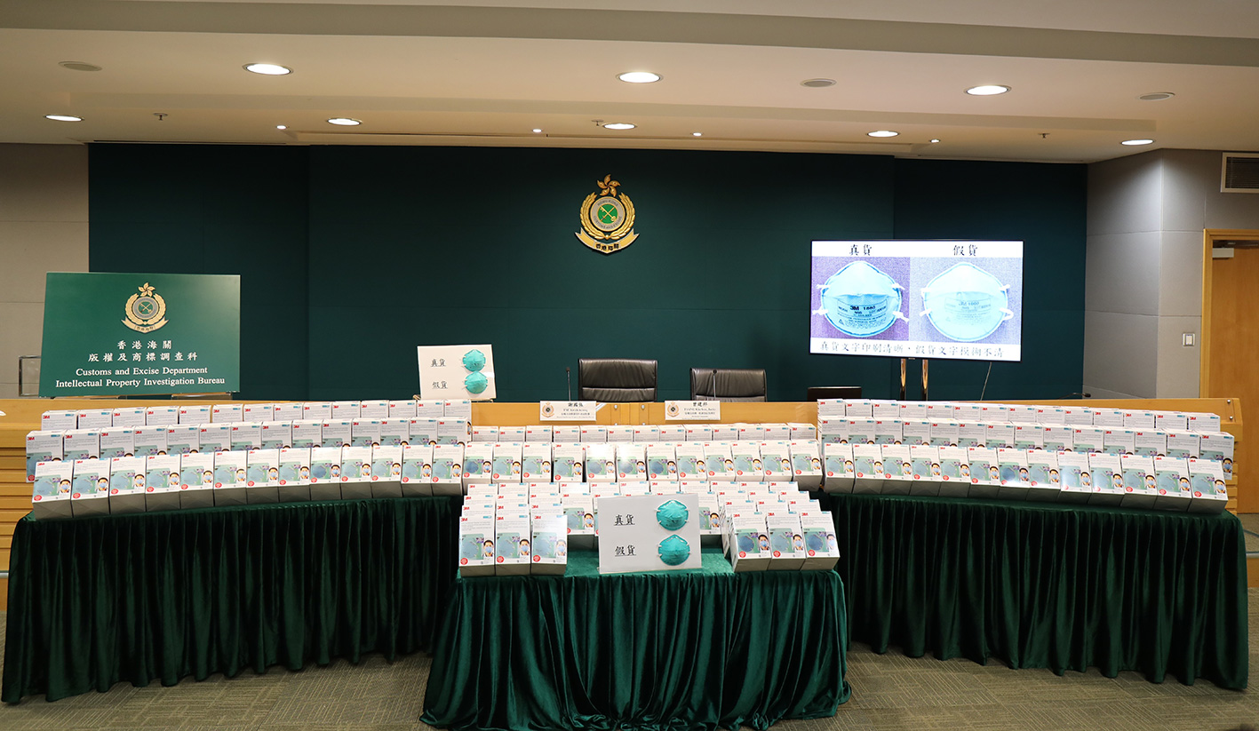 海關早前接獲舉報,指有公司售賣懷疑冒牌口罩。經調查及於商標持有人協助下,海關於上述日期採取執法行動,首先在元朗一個儲存倉庫檢獲該批懷疑冒牌醫療級別口罩。