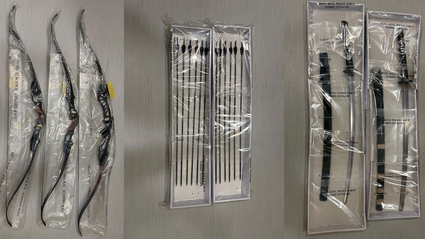 同一行動中,國安處於昨日下午突擊搜查九龍一單位,檢獲三把複合弓連同十二支箭及兩把武士刀。一名46歲本地男子因涉嫌違反《簡易程序治罪條例》下的「管有攻擊性武器並有所意圖」罪名被捕,現正被扣留調查。根據上述條例,一經定罪,最高可判處罰款5000元及監禁兩年。