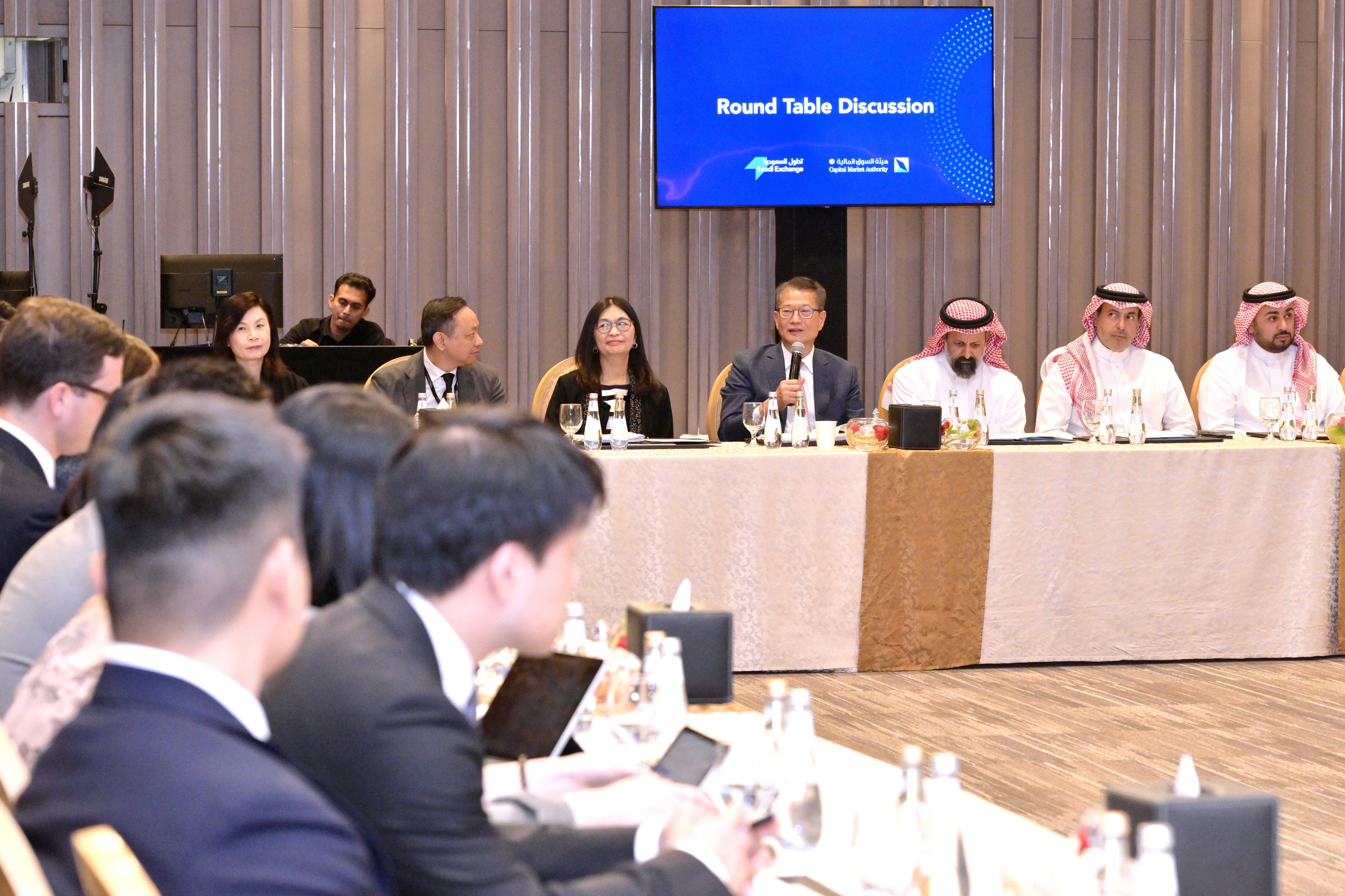 下午,陳茂波與沙特阿拉伯資本市場管理局主席Mohammed bin Abdullah Elkuwaiz共同主持資產市場的圓桌會議,兩地監管機構和多家資產管理機構的代表出席,就兩地金融市場最新發展及合作交流意見,並探討進一步加強合作的空間。