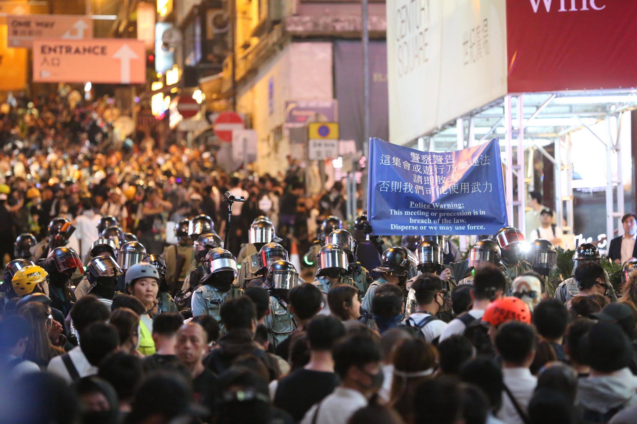 港台攝影記者周四(10月31日)晚上在蘭桂坊附近採訪期間,被警員用盾牌推撞及用電筒照射。攝影記者向警員提出質疑,要求對方提供警員編號,隨即兩度被正面噴胡椒水,需要送院治理。
