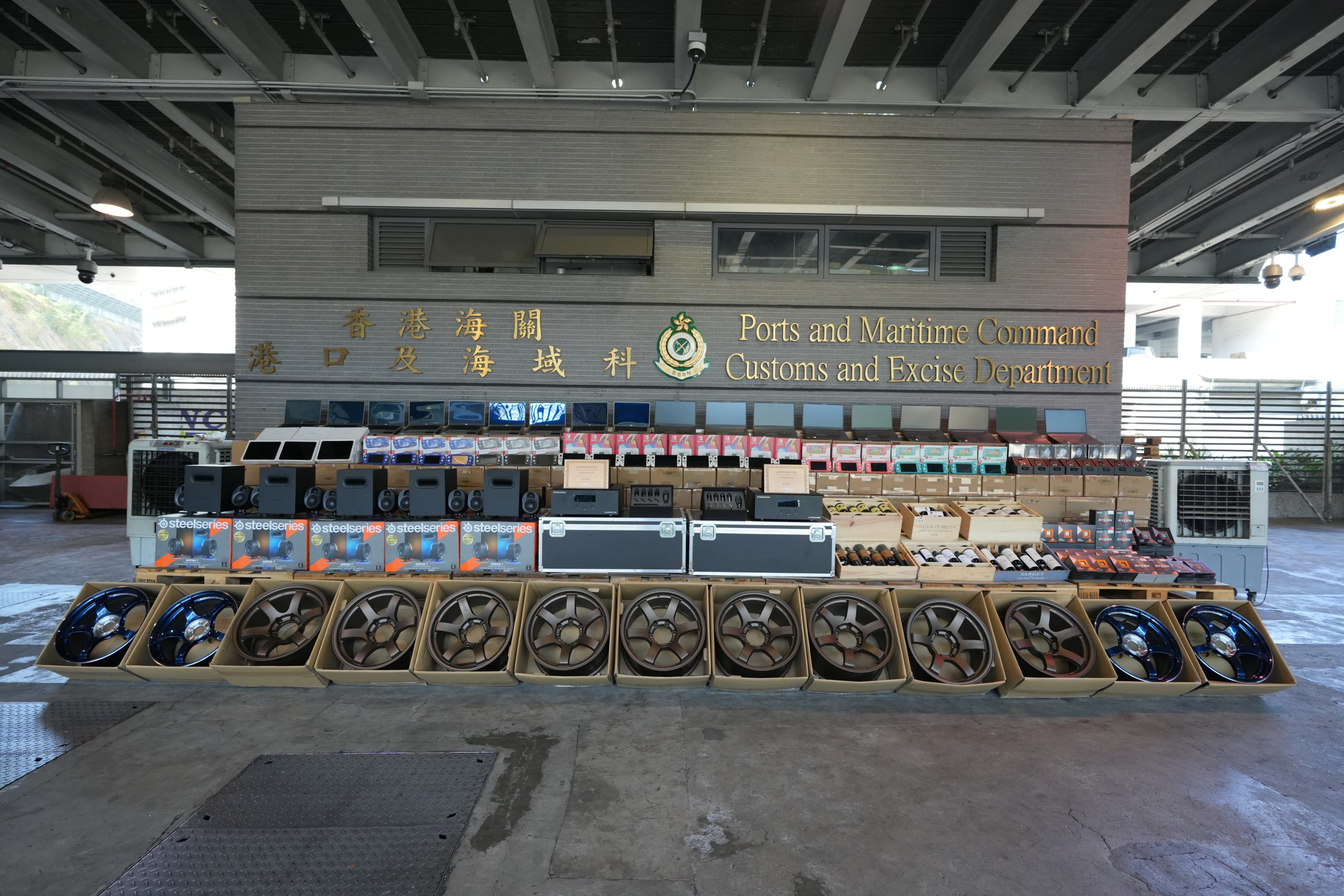 海關人員9月26日鎖定一艘準備由香港前往菲律賓的遠洋船作搜查,在船上兩個分別報稱載有塑膠保護行李箱及塑膠餐具的貨櫃內檢獲大批懷疑走私物品,包括全新汽車輪圈、紅酒、遊戲機套裝、中央處理器以及電子產品。
