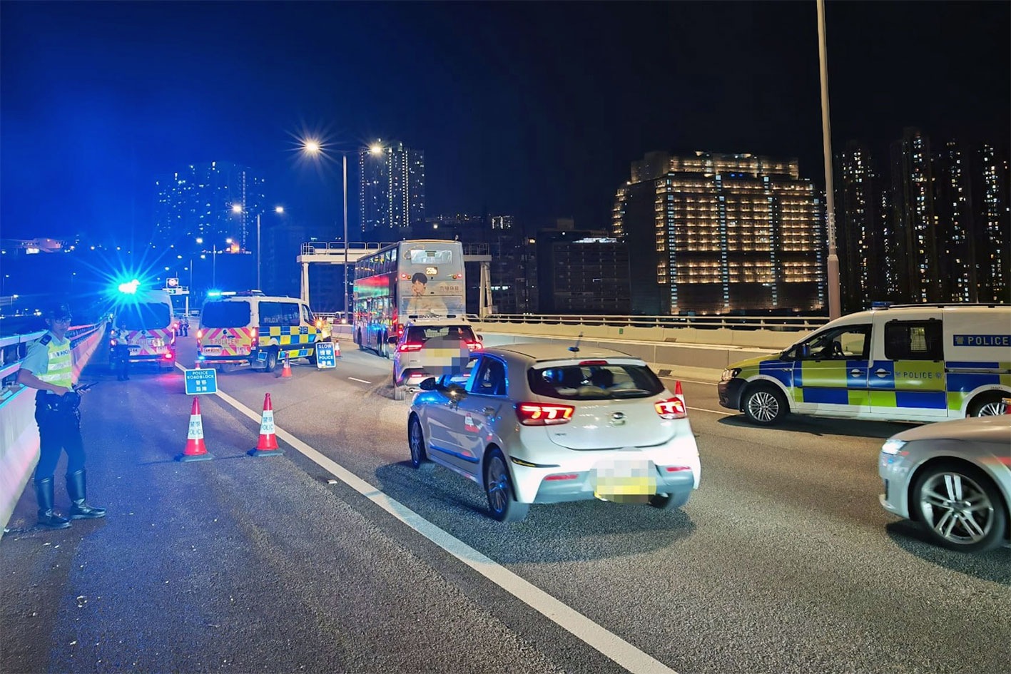 警方新界南總區交通部執行及管制組人員,為打擊酒後及毒後駕駛相關罪行,於萬聖節前後在區內主要幹道設置路障、截查可疑車輛,並為駕駛人士進行酒精呼氣測試。