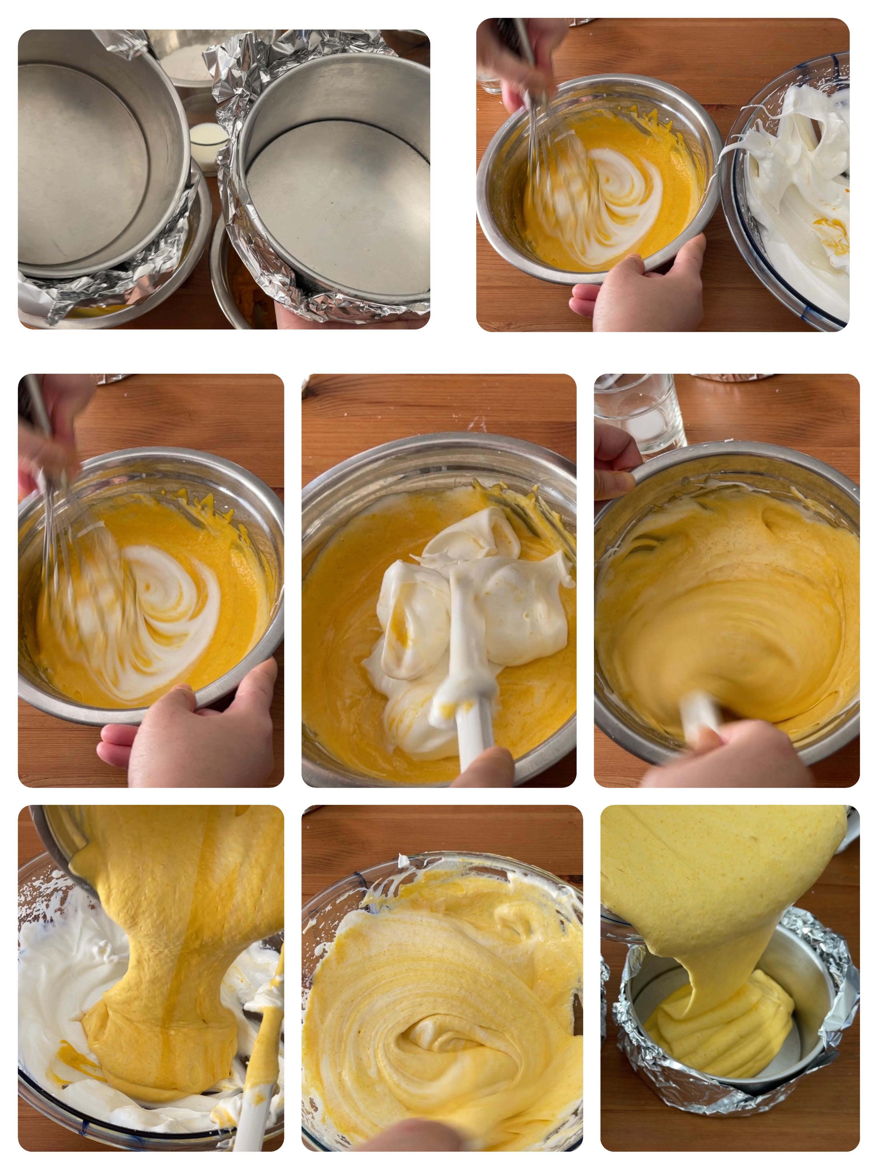 (7)將蛋白分三次加入麵糊中,慢慢拌至均勻,但也不要過度攪拌。