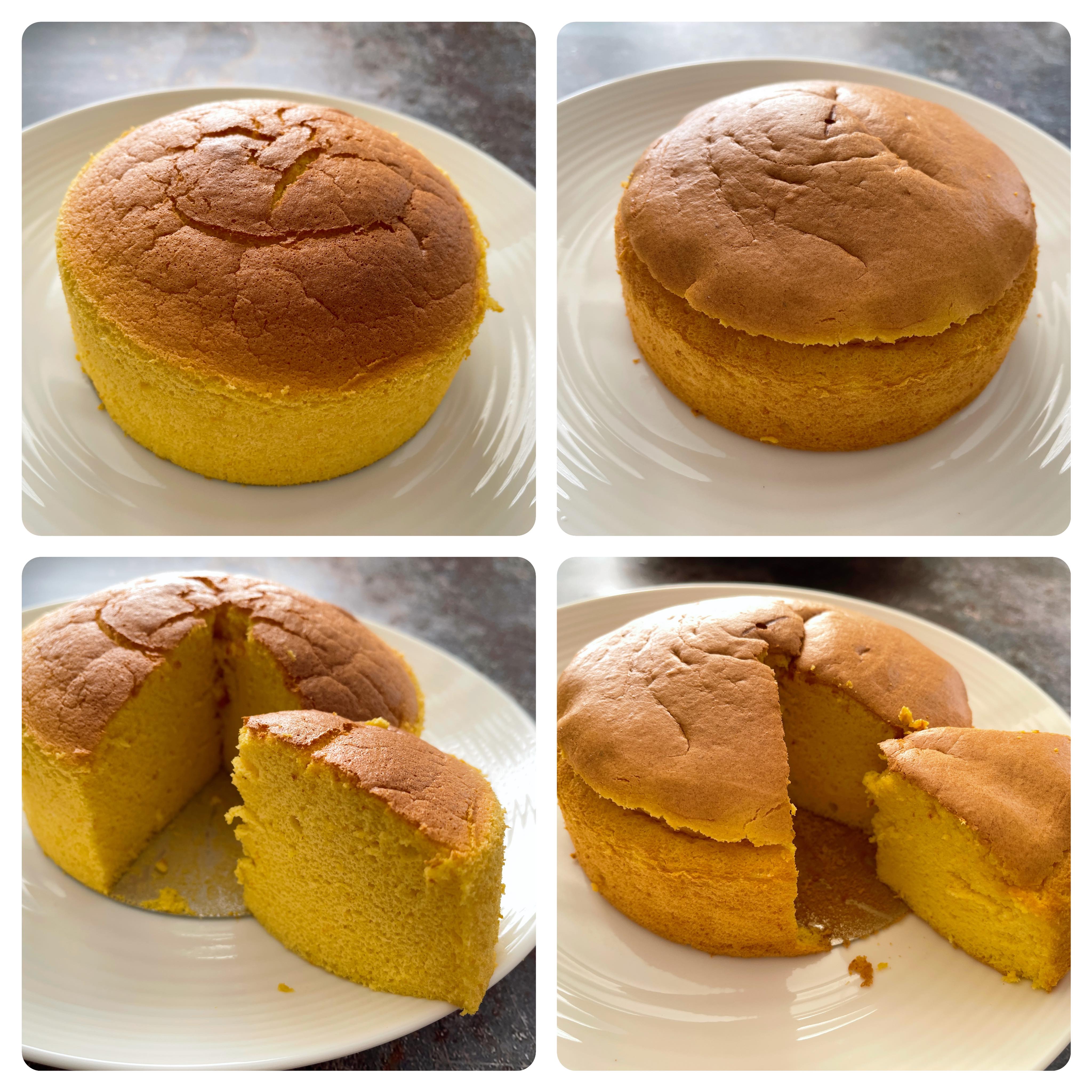 ★蛋糕經過倒扣後,會變的更軟棉,表皮用手觸摸也不脫不黏手才是熟,如黏手脫皮而且按壓蛋糕時有沙沙聲,即未熟透或應該說是蛋糕體內的濕氣未散,如是者就要調校焗的時間或溫度,因為始終不同焗爐和氣炸鍋的品牌功率馬力也各有不同