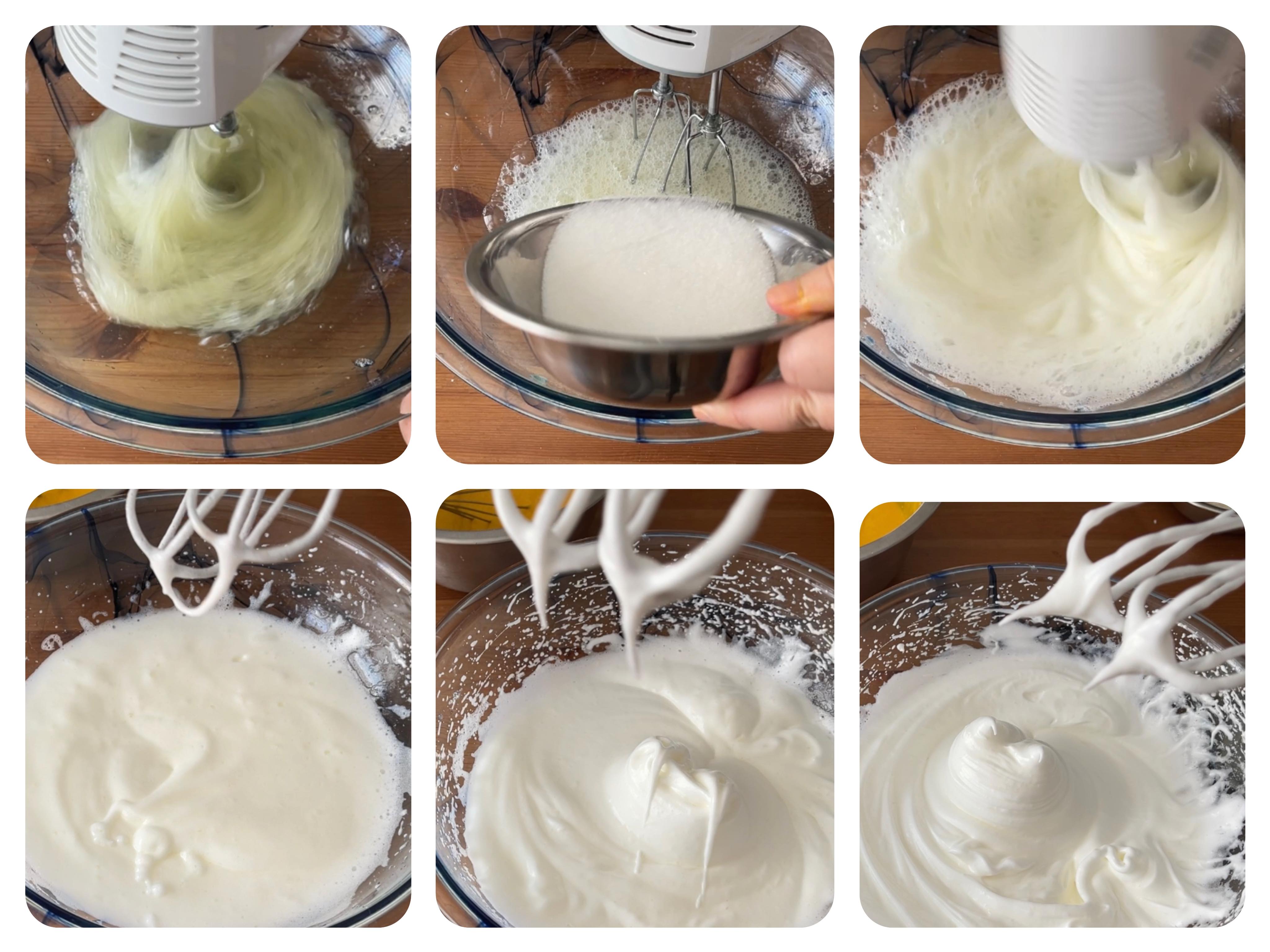 (6)蛋白的大碗內不可有油脂,如想的話可以加一些檸檬汁或他他粉,可使蛋白打發更穩定,不過我沒有加,然後分3次加入糖,先用快速後用慢速,打發蛋白至乾性打發的狀態即可,不要過度打發。