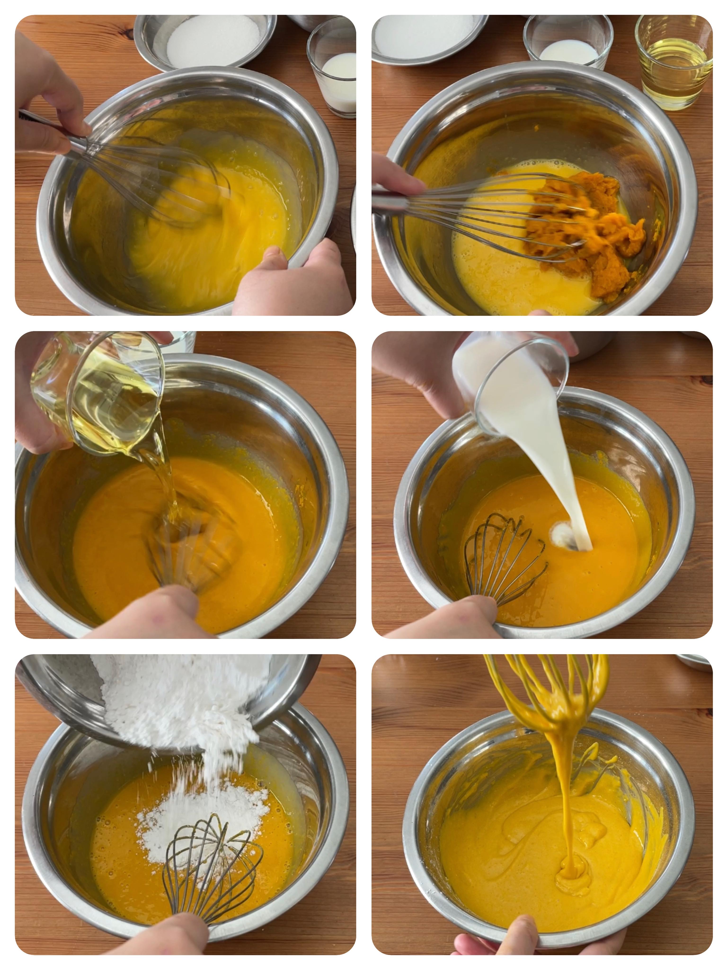 (4)將蛋黃打發散開,加入南瓜蓉、牛奶、油,攪拌至完全混合之後,再篩入低粘麵粉拌勻,成了稠得來流質狀就可以。
