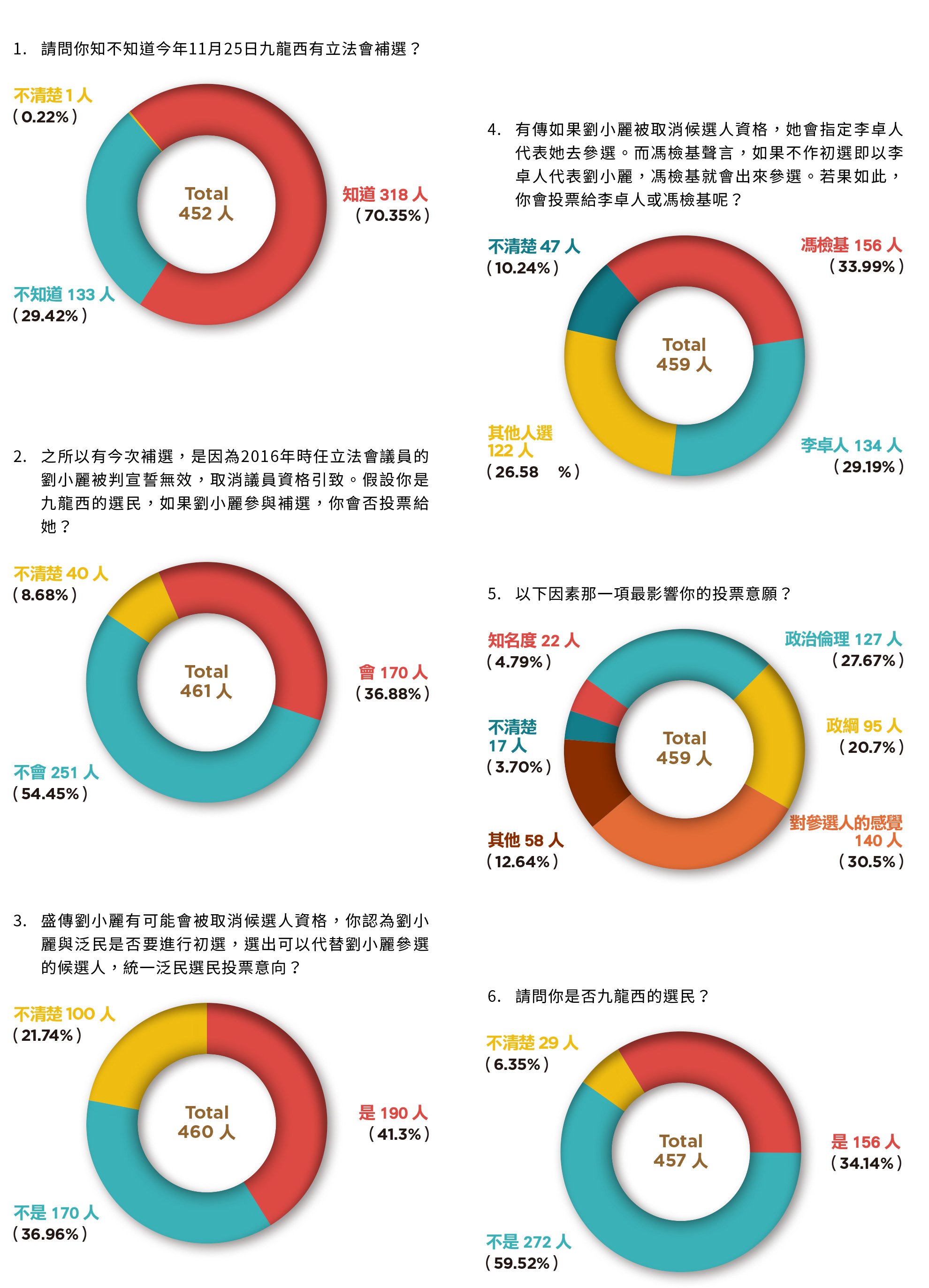 就今次補選而言,多數人認為對參選人之觀感與政治倫理,最影響投票意願。重視對參選人的感覺佔30.5%(140人),政治倫理佔27.67%(127人),政綱佔20.7%(95人),其他因素佔12.64%(58人),知名度佔4.79%(22人),不清楚的佔3.70%(17人)。
