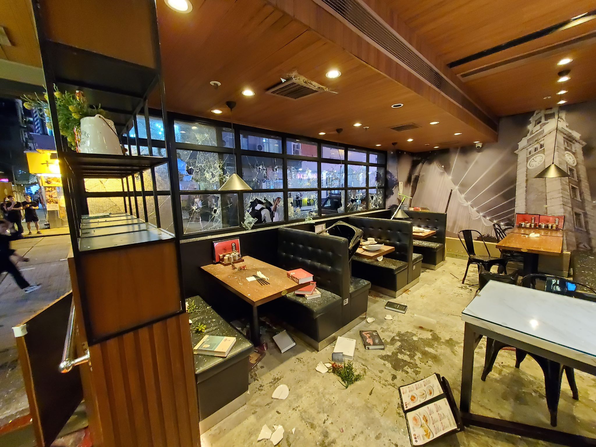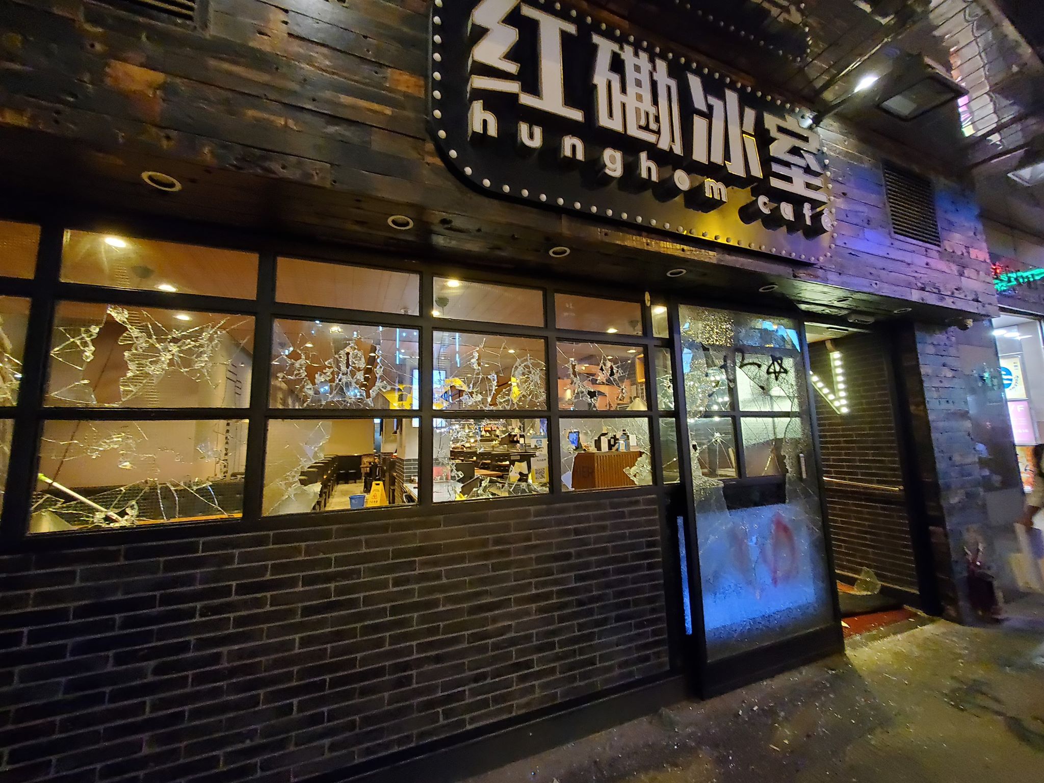 現場所見,紅磡冰室被打爆玻璃。