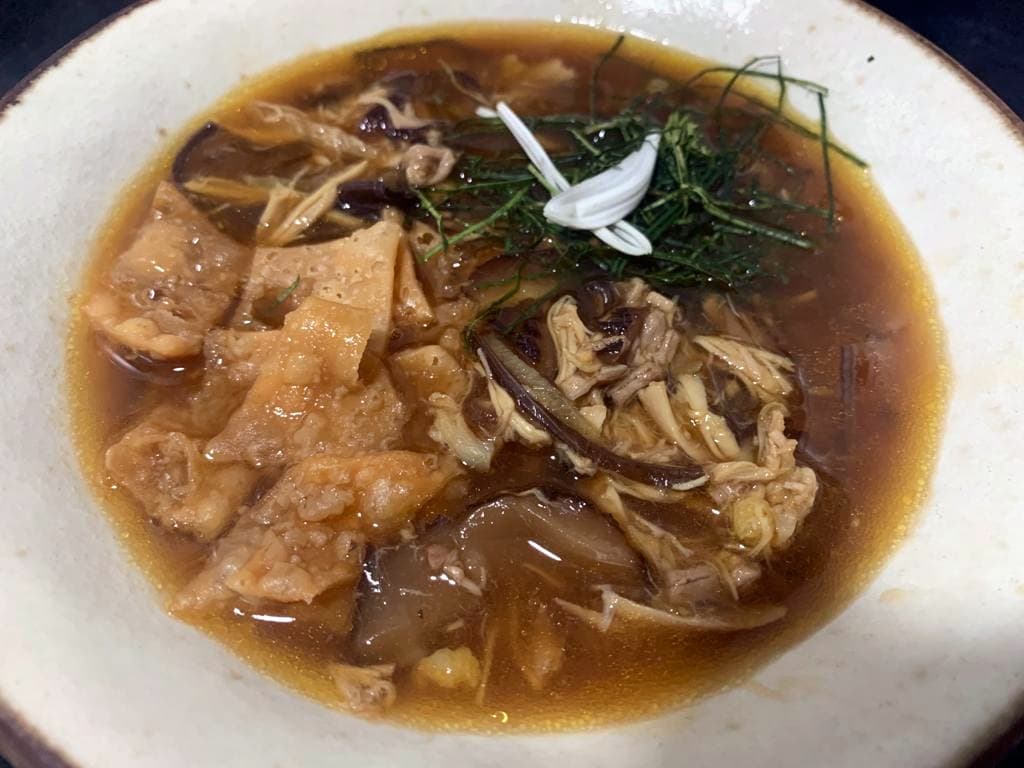 材料:雞半隻、西施骨、金華火腿、陳皮、木耳、冬菇、薑絲、檸檬葉、白菊瓣、薄脆