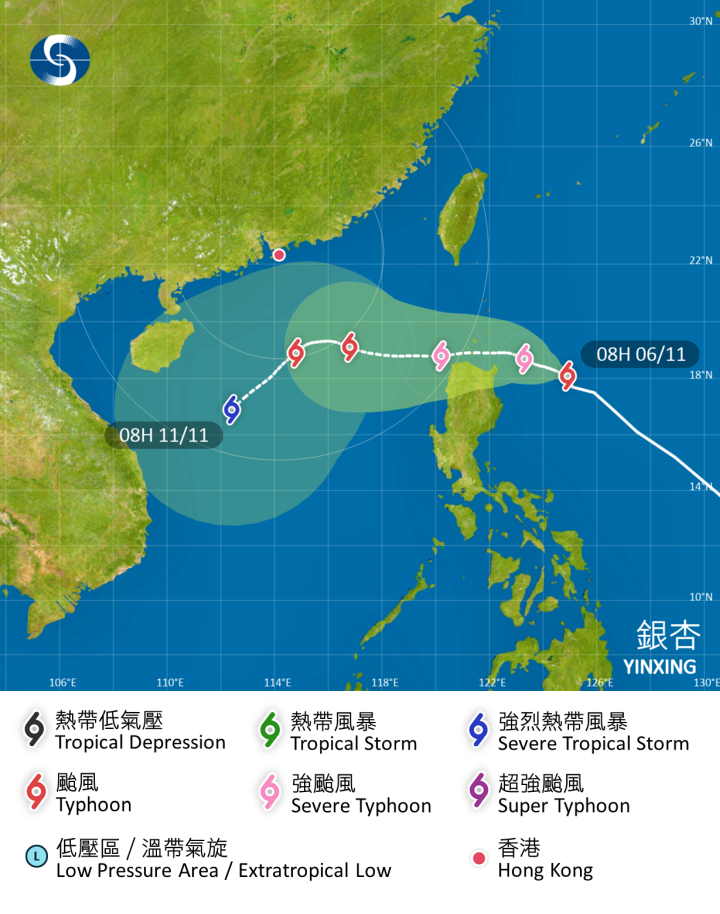 根據現時預測,現時位於呂宋以東海域的熱帶氣旋「銀杏」會在星期四(11月7日)晚上至星期五(11月8日)早上進入本港800公里範圍,並採取偏西方向移動,橫過南海北部。受東北季候風影響,「銀杏」進入南海後的路徑及強度存在變數。雖然銀杏的環流較為細小,但在東北季候風及銀杏的共同影響下,週末期間華南沿岸海域及高地風勢頗大。