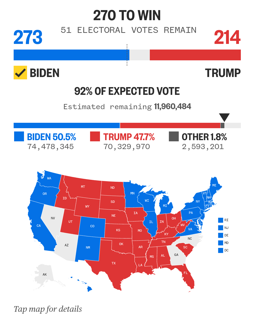 NBC推算,拜登已取得賓夕法尼亞州,共取得273張選舉人票,多過270張的當選門檻。