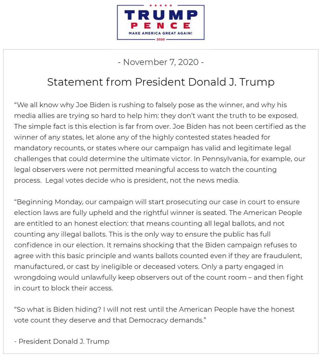 特朗普表示,拜登急於冒充勝出者,以及他的媒體盟友努力去幫助他,是因為不希望真相被曝光。特朗普強調選舉還未結束,拜登未確認為任何州的贏家。