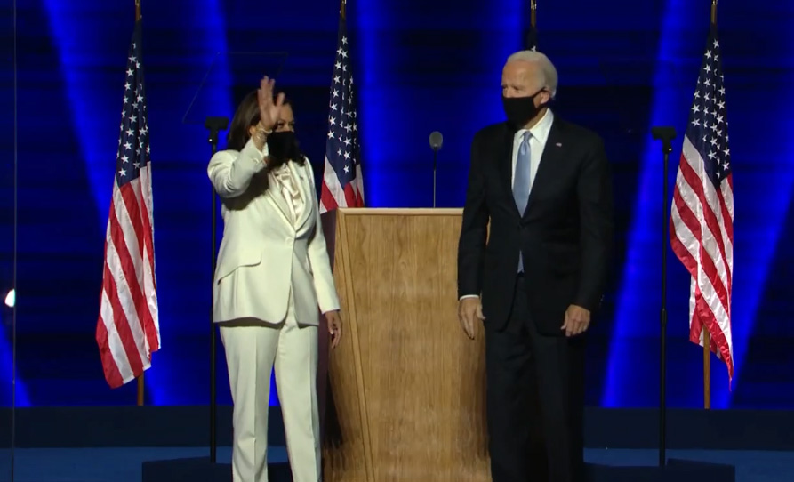 拜登及他的副手賀錦麗於特拉華州向全國演說,指會全心全意工作,將團結國家,不分藍紅,不能視競爭對手為敵人,是時間放下歧見,並會與共和黨人合作。