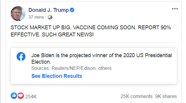 特朗普之後留言,指「股市大升,疫苗即將上市。報告有效90%。好消息!」,雖然留言與選舉毫無關係,但Facebook仍然標示「拜登是2020年總統大選的預計勝出者」。