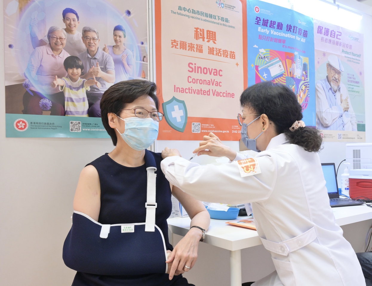 行政長官林鄭月娥今日(11月11日)在渣華道體育館,接種第三劑科興新冠疫苗,並在負責疫苗接種計劃的公務員事務局局長聶德權和食物及衞生局局長陳肇始陪同下視察中心運作。聶德權和陳肇始亦在今日接種第三劑科興疫苗。
