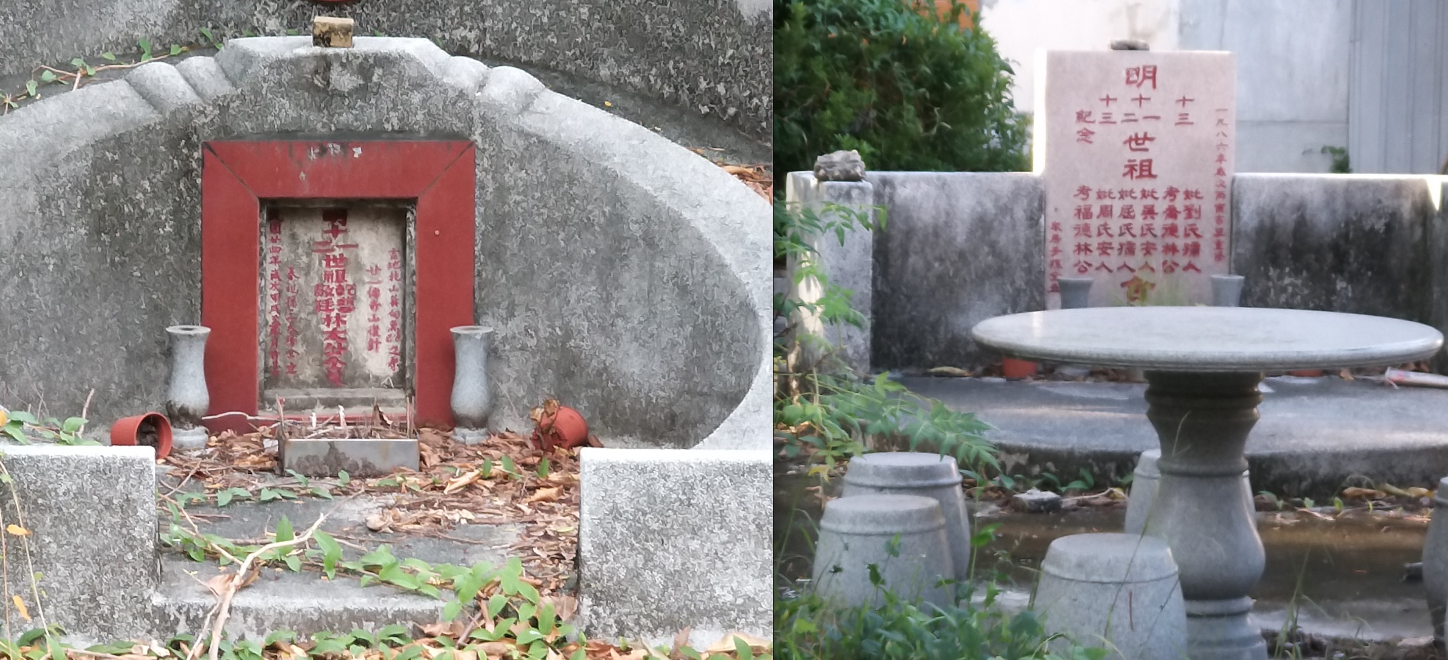 走到牆前從棱條間隙往內窺看,會發現牆後是一座隱世墓園,園內有大小兩座中式墓塚。在墓園深處豎立著一道白色橫幅,上面印有「九龍竹園蒲崗村林氏宗族墓園」十三個紅色大字,原來這裡是昔日曾紮根九龍虎頭山下(殖民時期改名獅子山)竹園和蒲崗的林氏,所建立的祖宗墓塚。