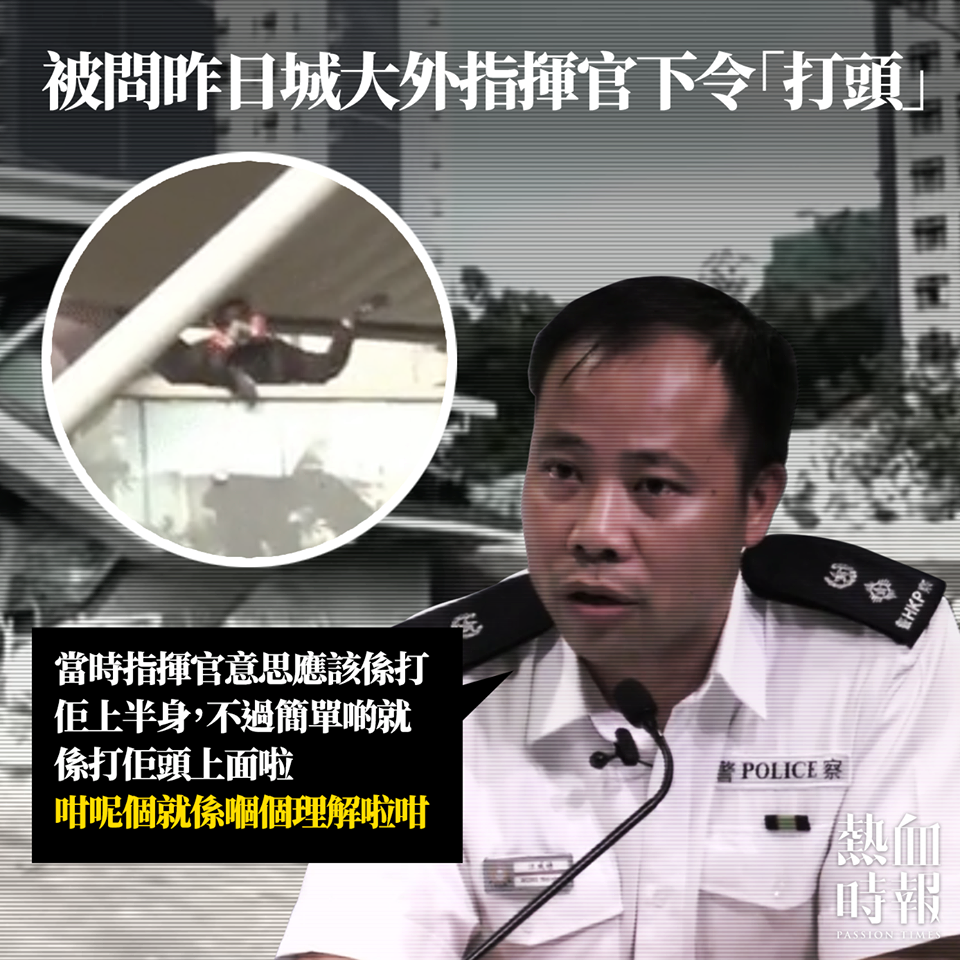 昨日(11月12日)早上,有示威者在香港城市大學附近的天橋,當時有警方指揮官命指「喂,凸個頭就打個頭呀」,然後一名防暴警察抬起長槍,瞄準天橋位置開槍。