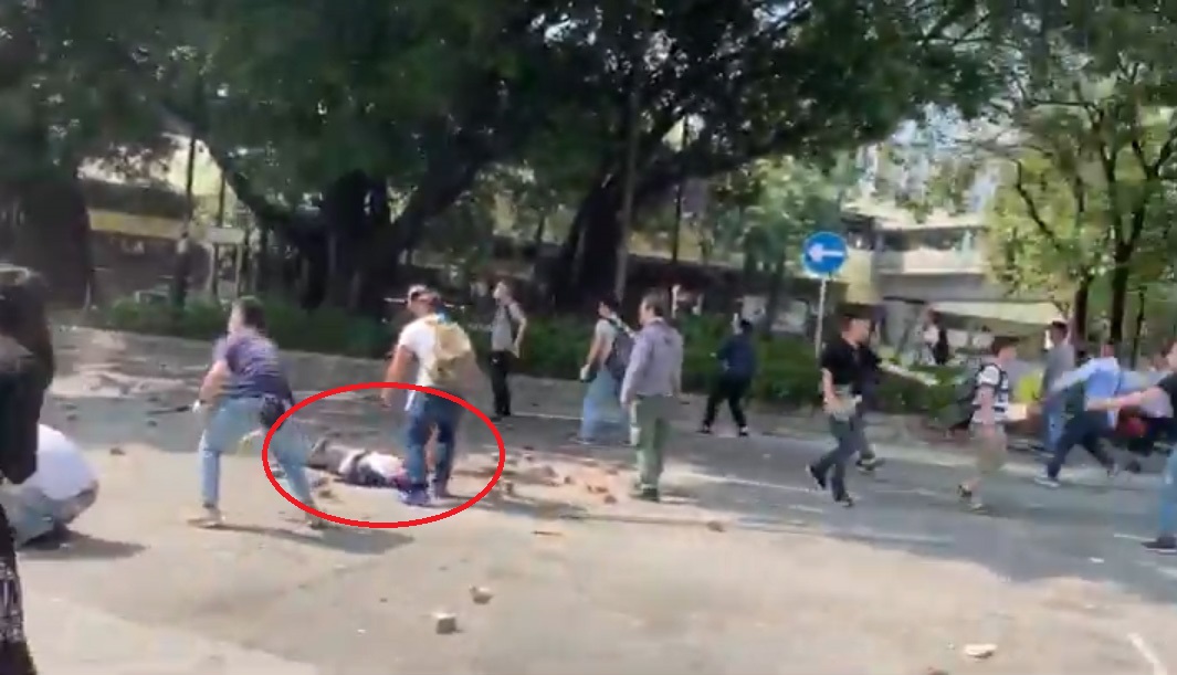 事主當時在馬路上用手提電話拍攝,混亂中被磚掟中,即時倒地,然而掟磚激戰未有即時停止,片段中更聽到有人大叫「死曱甴」,之後示威者後撤。