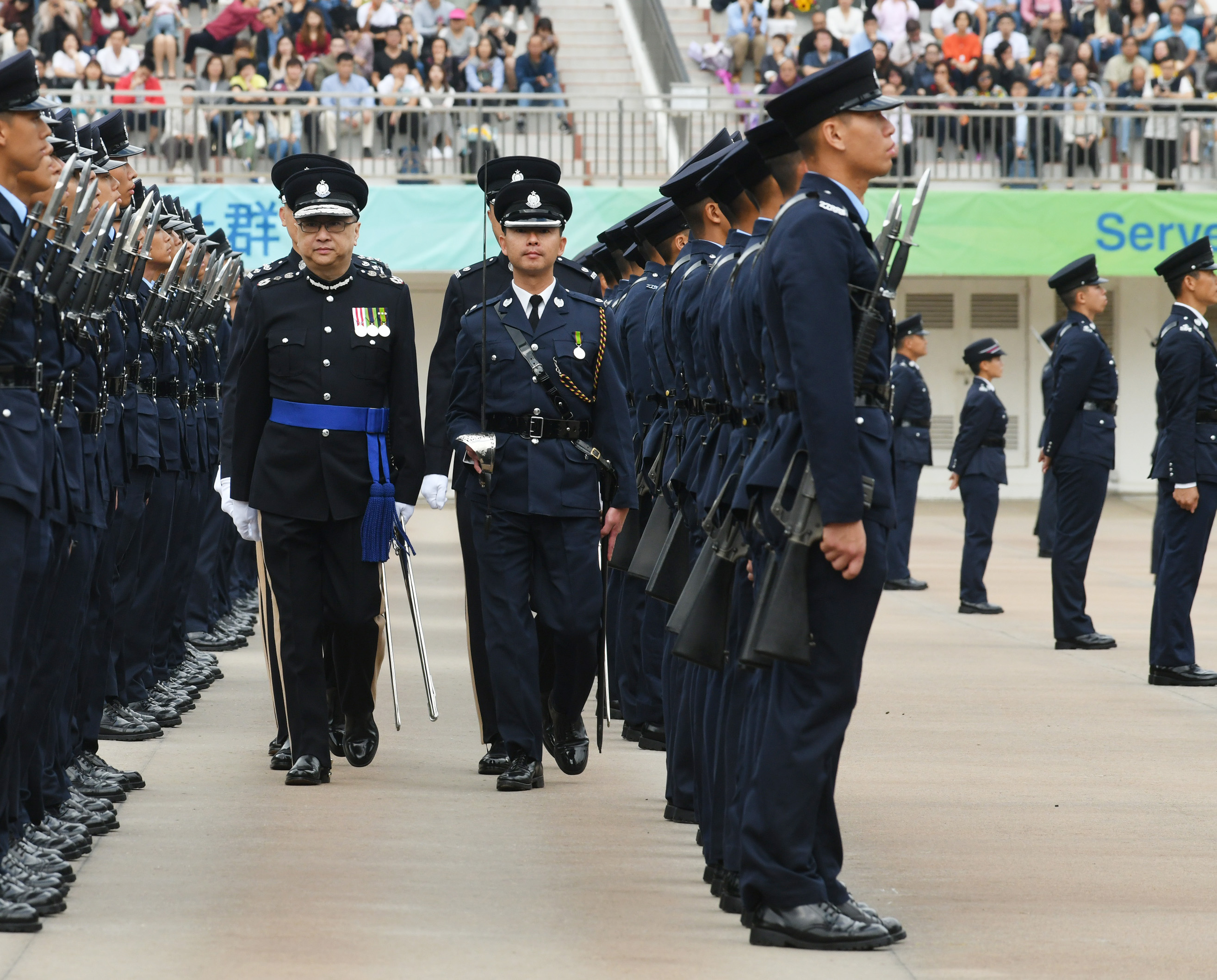 即將退休的警務處處長盧偉聰,今日(11月16日)最後一次出席警察學院結業會操,以檢閱官身份主持見習督察班及學警班的結業典禮。