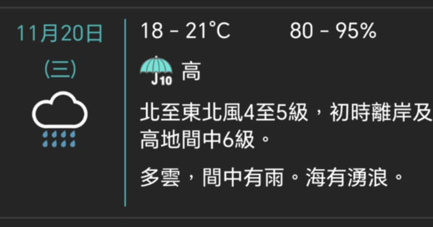 一股達強風程度的東北季候風會在今日(11月17日)晚上逐漸影響華南沿岸,屆時天文台會視乎本地風力變化考慮發出強烈季候風信號。同時,預料熱帶氣旋「萬宜」會於今晚至星期一(11月18日)初時進入本港800公里範圍,並逐漸靠近華南沿岸,在東北季候風及「萬宜」的共同影響下,星期一及星期二(11月19日)該區風勢逐漸增強,天文台屆時會發出熱帶氣旋警告信號。