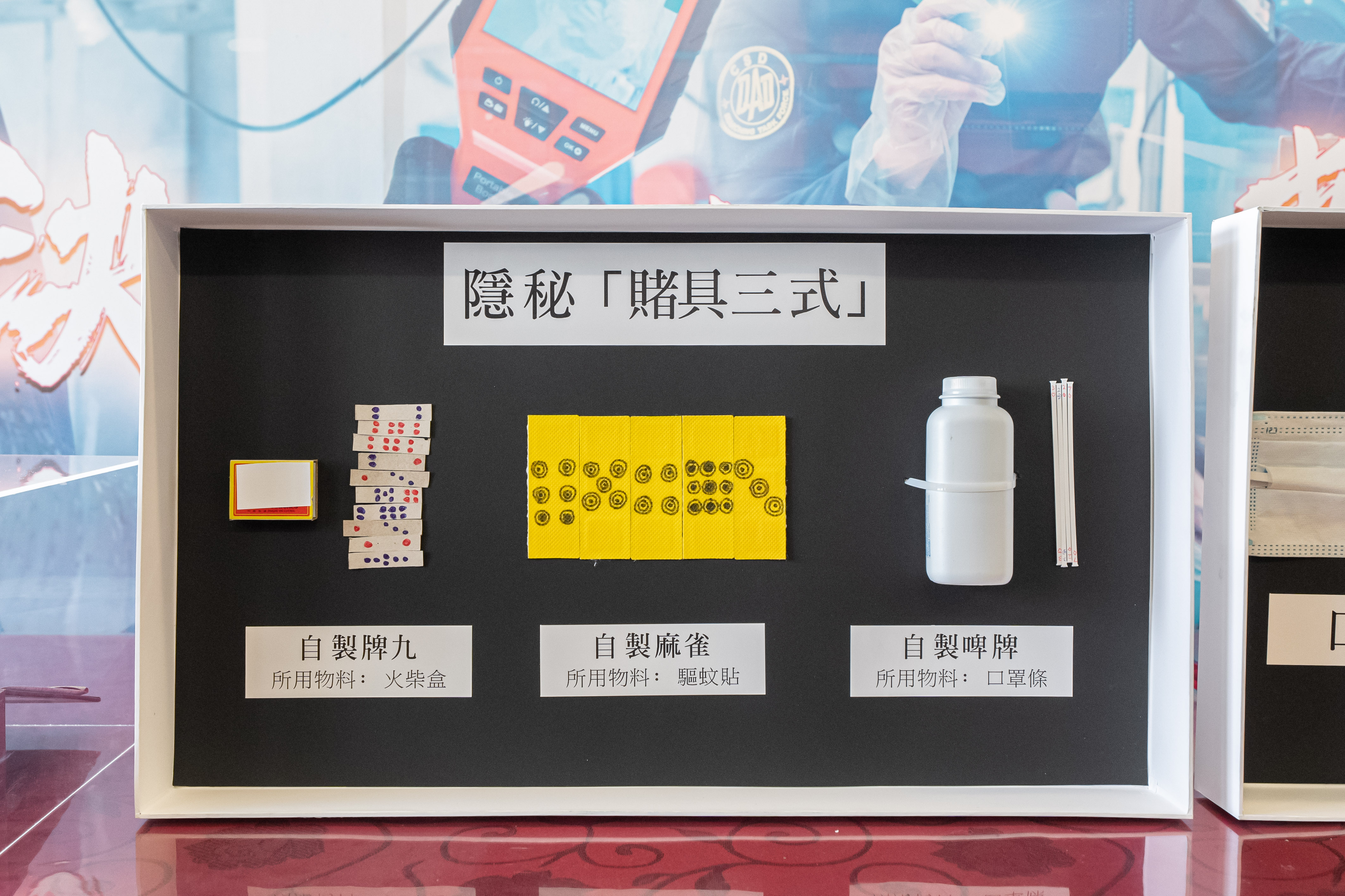 在簡報會上,署方展示於行動中搜獲由在囚人士自製的賭博工具,包括用驅蚊貼製成的麻雀,以及用口罩條製成的啤牌。