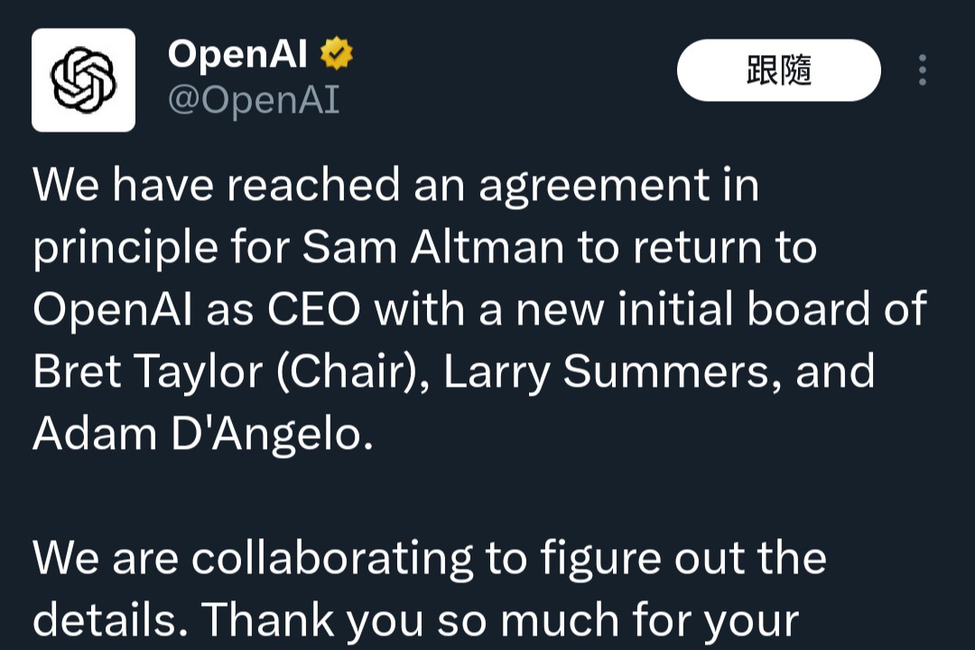 We have reached an agreement in principle for Sam Altman to return to OpenAI as CEO with a new initial board of Bret Taylor (Chair), Larry Summers, and Adam D'Angelo.
