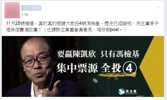 本報的節目群組亦有人刊貼相關圖片,並呼籲投票予馮檢基,內容為「11月25日補選,真的真的懇請大家投4號馮檢基。」該帖文已被刪除。