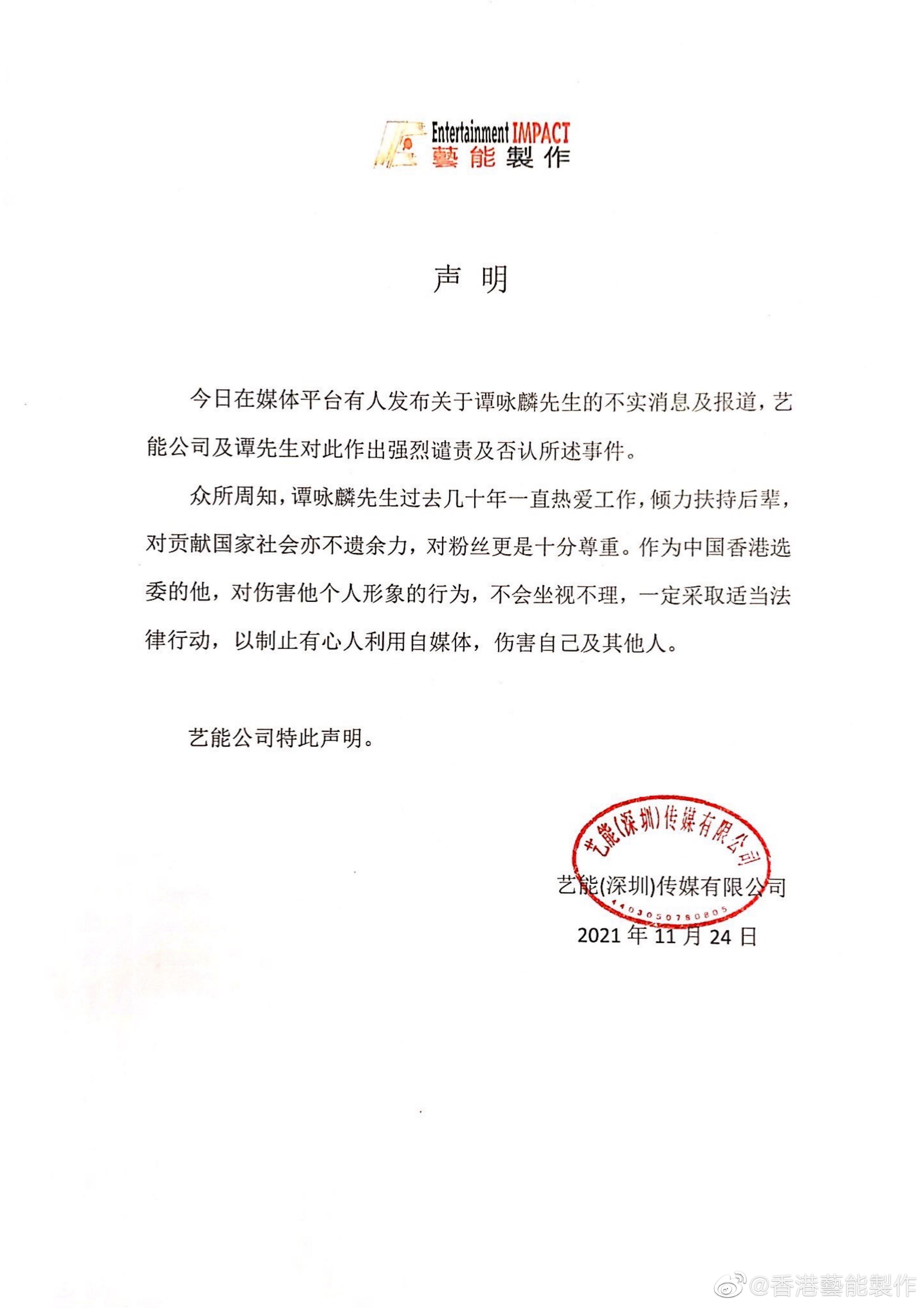 譚詠麟今日(11月24日)在微博轉發藝能發出的聲明,提到「今日在媒體平台有人發布關於譚詠麟先生的不實消息及報道,藝能公司及譚先生對此作出強烈譴責及否認所述事件。」