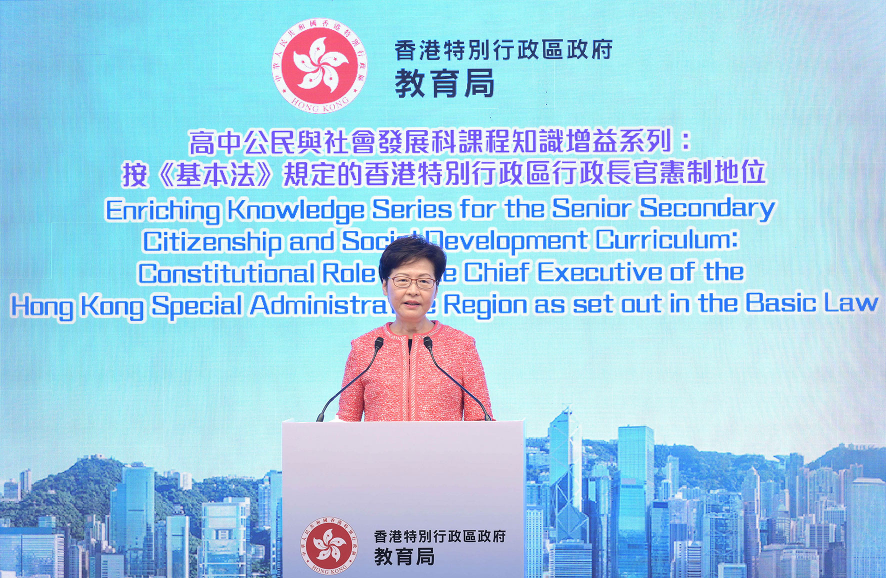 今日(11月25日)行政長官林鄭月娥向高中的公民與社會發展科教師授課,主題是「按《基本法》規定的香港特區行政長官憲政地位」。