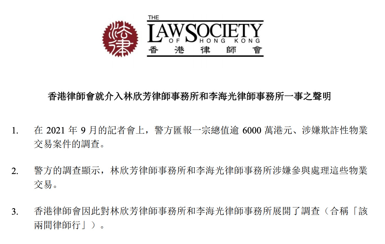 香港律師會今日(11月25日)發聲明,指林欣芳律師事務所及李海光律師事務所涉嫌參與欺詐交易,會方決定介入及接管,並終止事務。