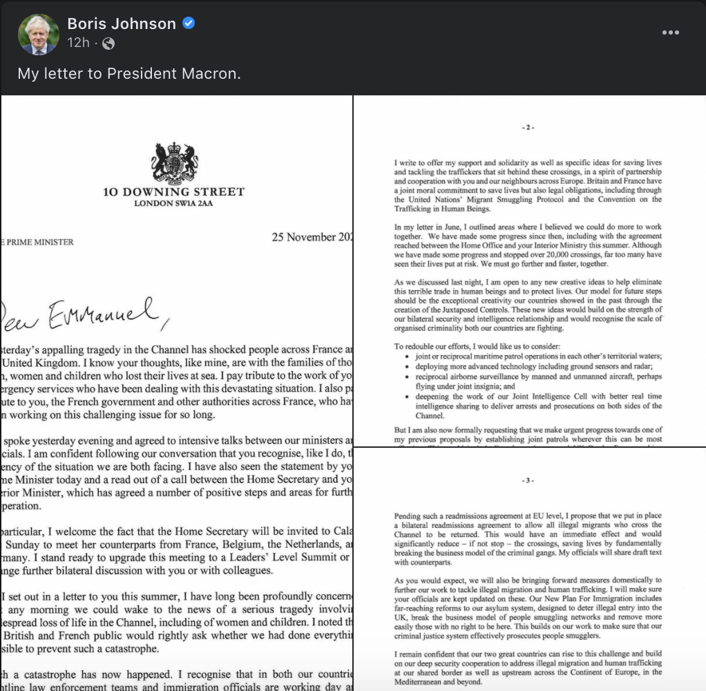 及後約翰遜去信馬克龍提出多項建議,提出多項建議堵截偷渡者包括兩國簽訂協議,把偷渡者遣返到法國、加強情報交流和巡邏、利用新科技偵測等;隨後又在社交平台公開信件,引發外交風波。