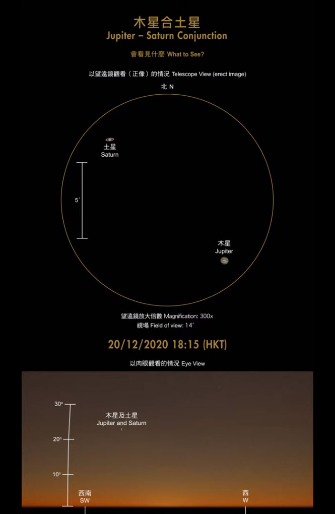 木星合土星是指木星和土星運行至黃經相同的位置,大約每20年才出現一次,屬較為少見的天文現象。在12月21日,木星和土星在視覺上會極為靠近,相隔只有約六角分,大概五分之一個月球大小,市民未必能夠以肉眼分辨出兩顆行星,是近400年以來最接近的一次。當晚市民可於下午6時至7時30分期間,往西南偏西方向視野廣闊的地方觀賞兩顆行星。市民亦可於12月21日前後一日晚上觀賞兩顆行星,它們仍然非常靠近。