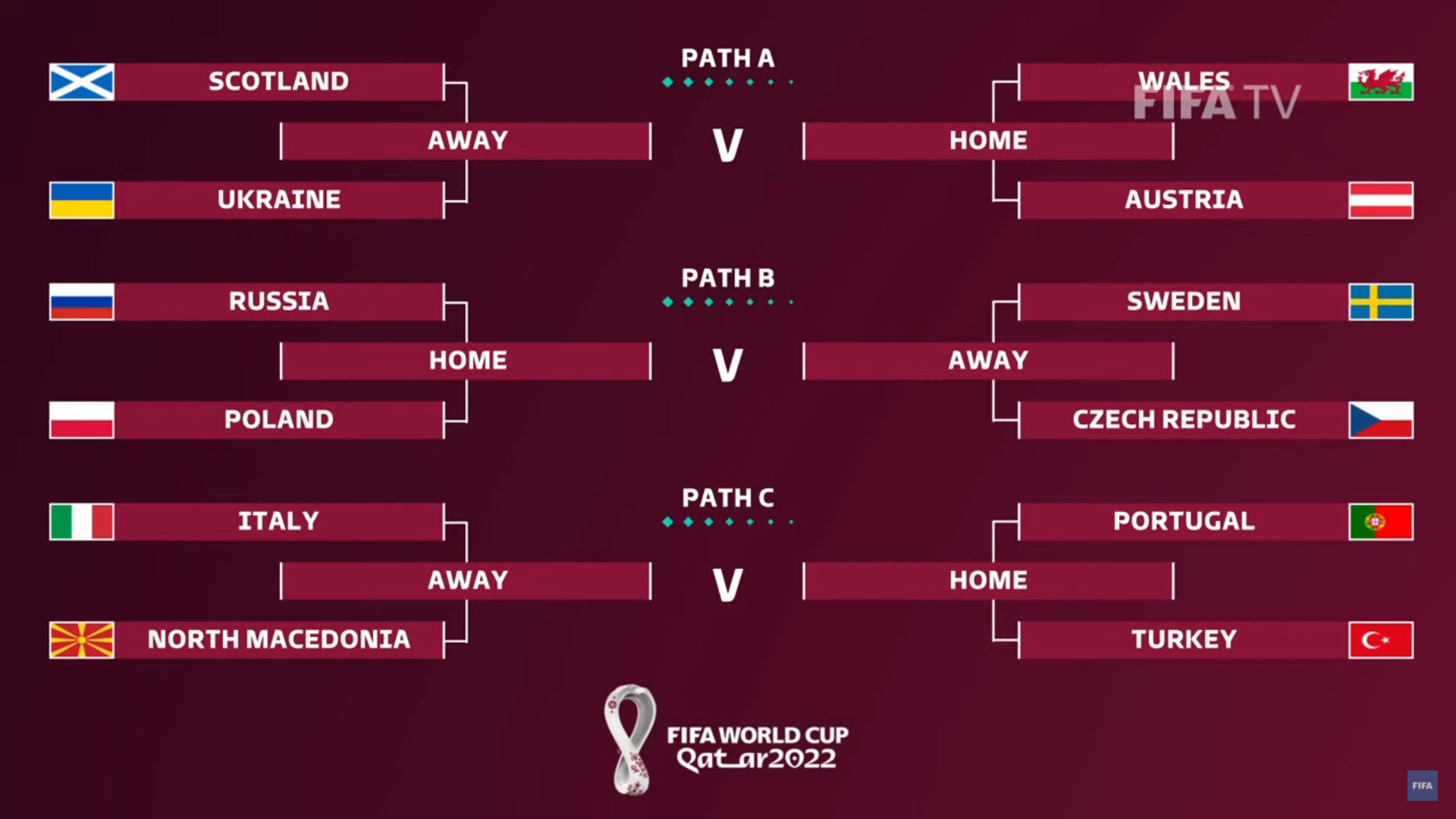 2022卡塔爾世界盃的歐洲區外圍賽附加賽,於周五(11月26日)完成抽籤,結果兩大勁旅意大利及葡萄牙被抽入同一組,兩隊歐洲冠軍最多只能活一隊。