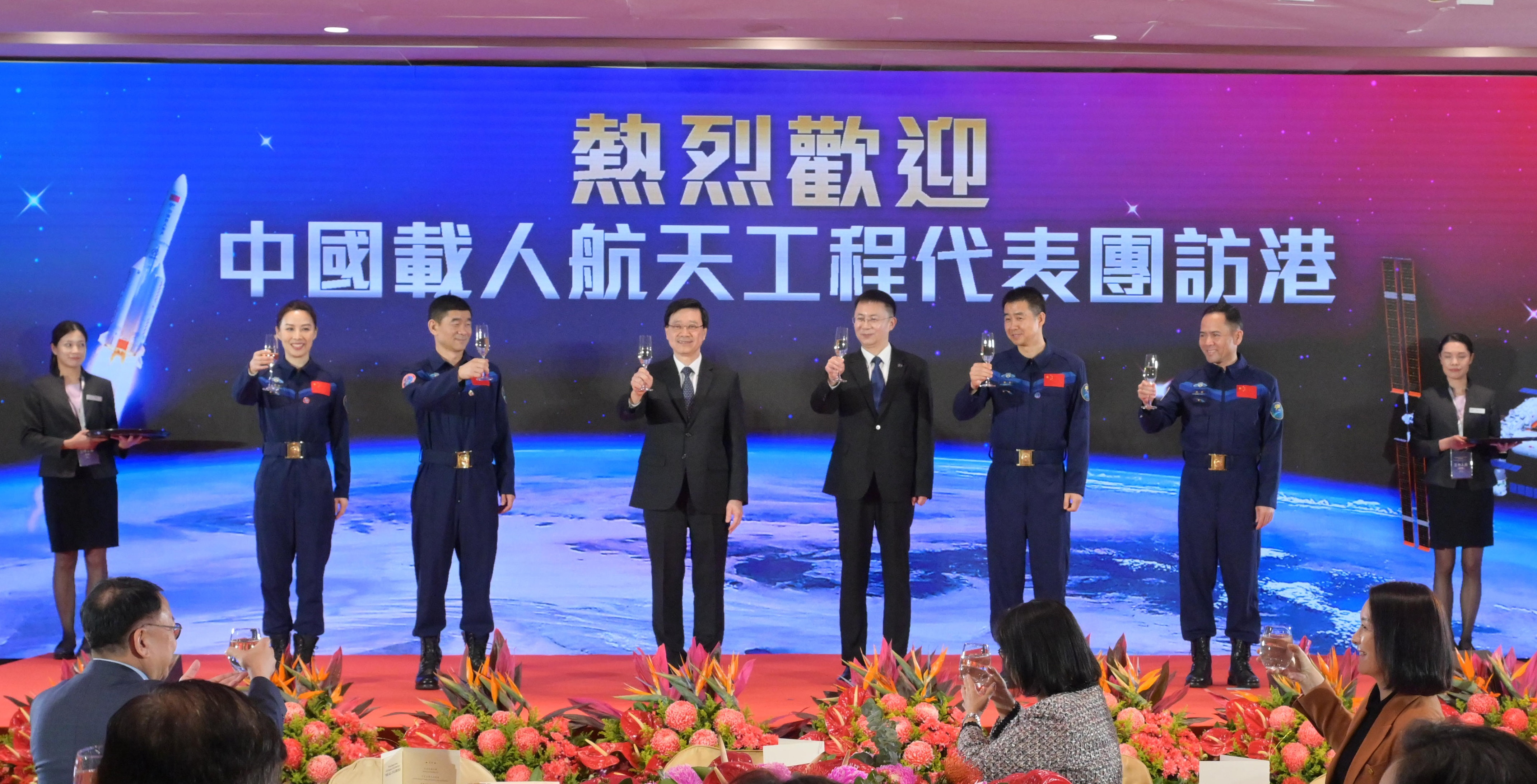 行政長官李家超致歡迎辭,他指中國載人航天工程在超過三十年以來,作出一項又一項突破,向全世界展示如何以「中國速度」,朝着航天夢進發。所創下的成就,讓作為中華兒女的我們,都感到份外驕傲和自豪。