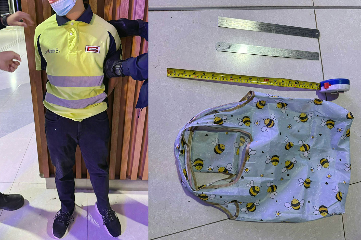 東九龍衝鋒隊接報趕往現場,當場制伏該名男子,並在他身上檢獲鐵尺、拉尺及環保袋,他涉嫌企圖盜竊被捕。