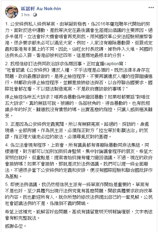 區諾軒今晚(12月2日)在社交網站貼文,相信「修訂法例同政治訴求係兩回事」,他續指「停止檢控係咪五大訴求?唔再告暴動係咪撤回暴動?如果咁都要話"對唔住五大訴求",真的無話可說」,他認為出賣甚麼的指控,只讓人感到極其難受。