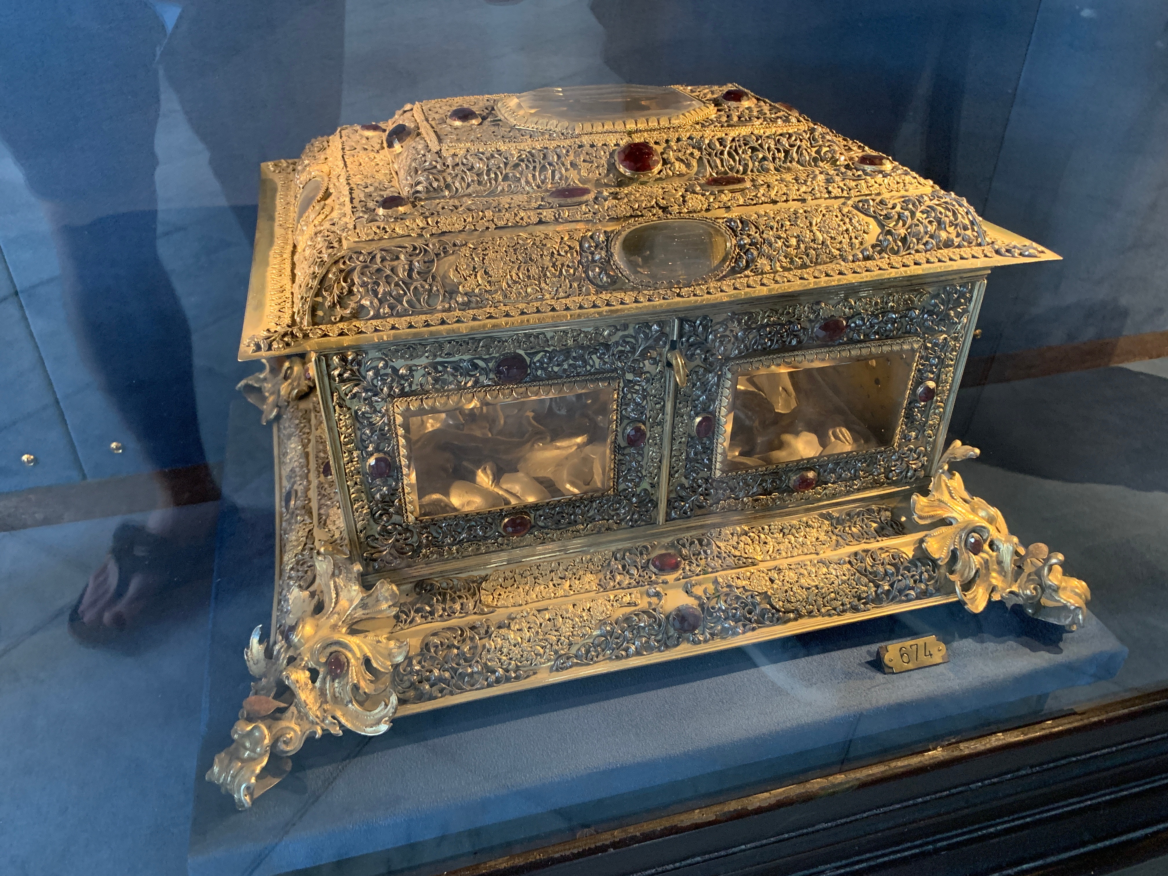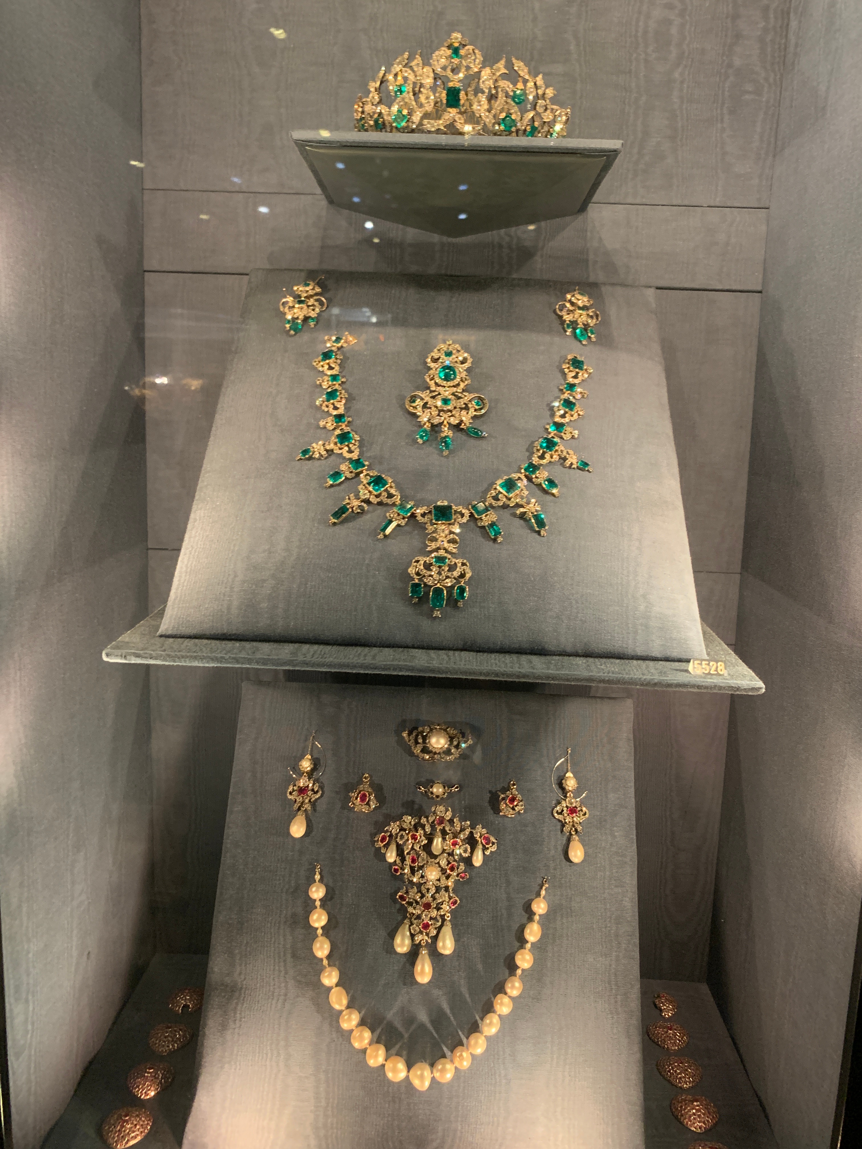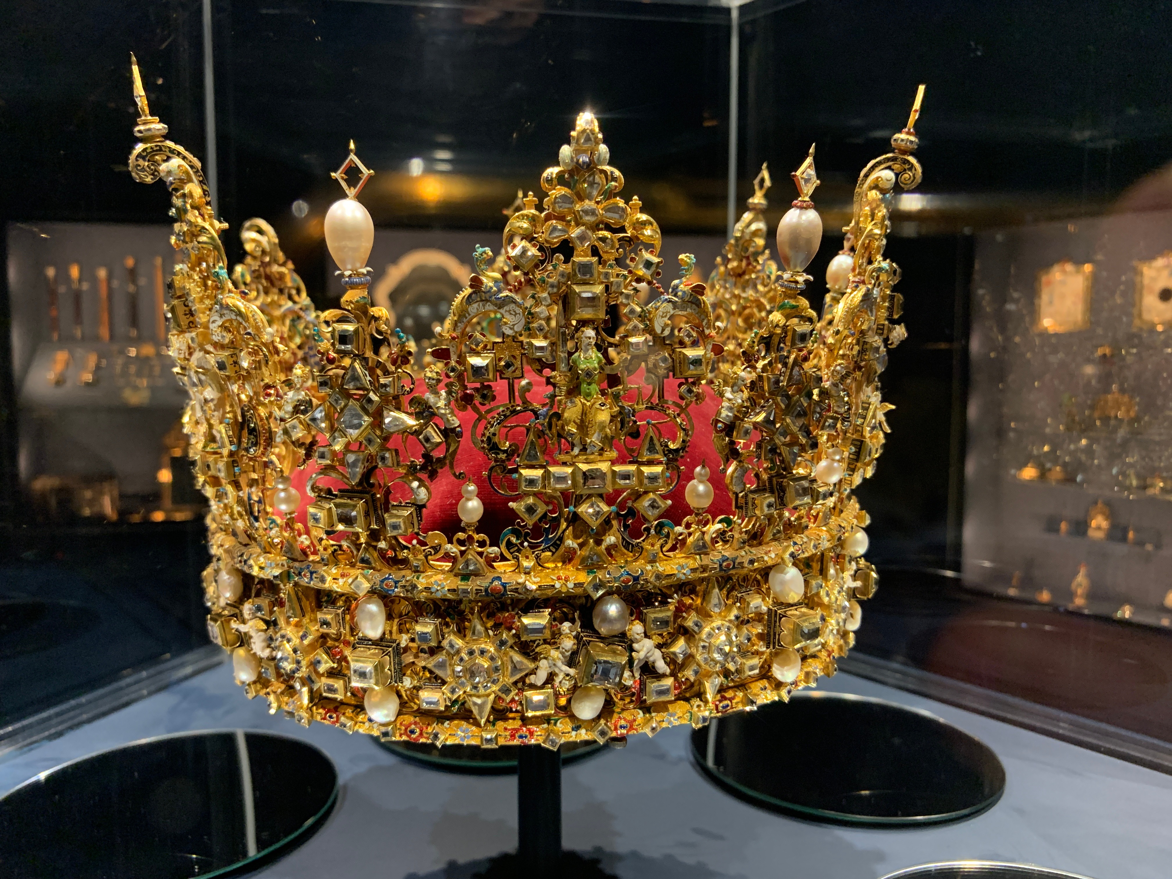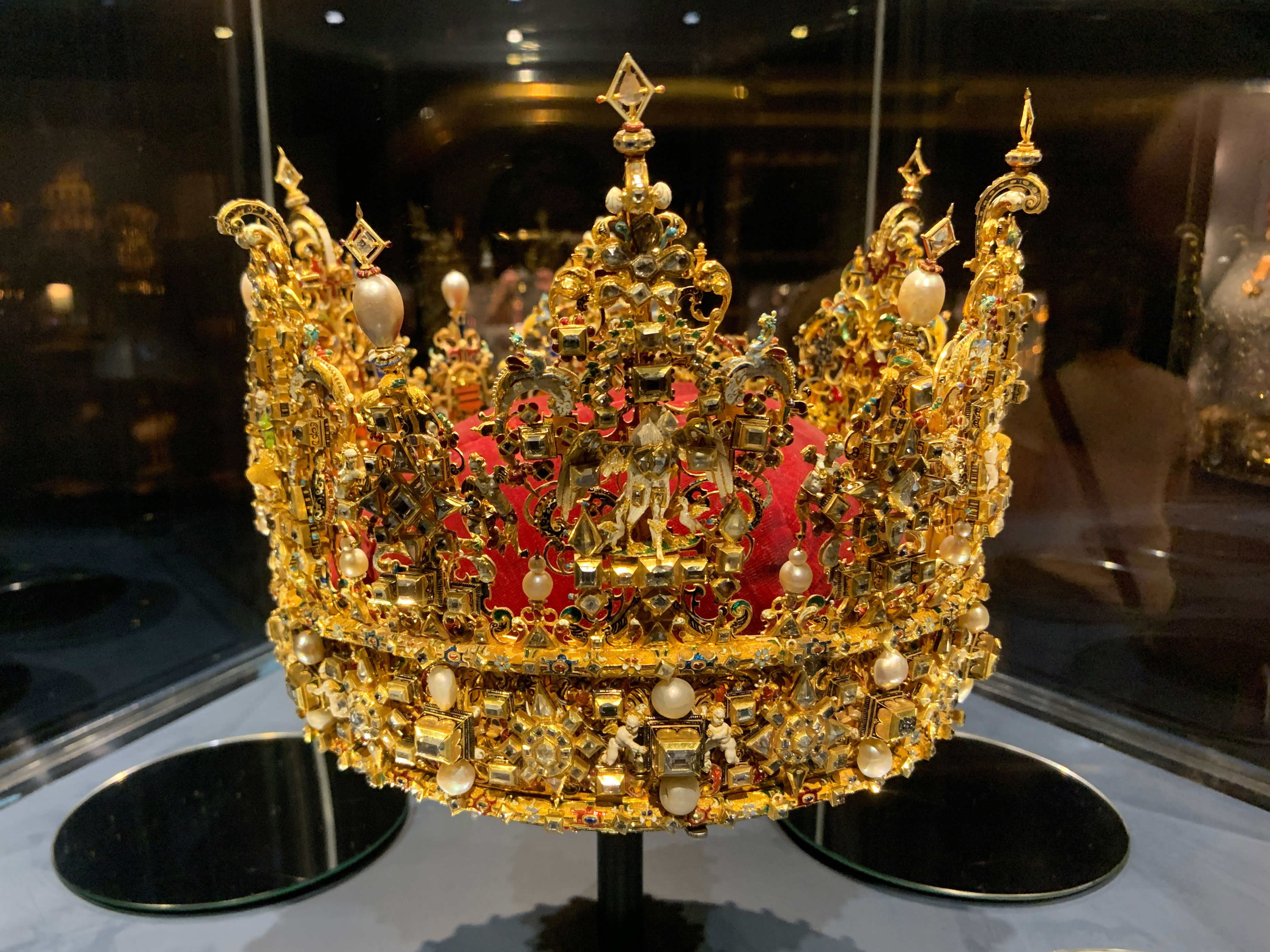 參觀完城堡的地面樓層,我們走到地底一層。這是城堡裡最主要的景點,守衛也比較森嚴,因為這裡擺放了歷代皇室的珠寶,包括了多個皇冠和后冠。大量的黃金和寶石的珠寶放滿了地下室小小的空間,遊客也在這層駐足比較久。