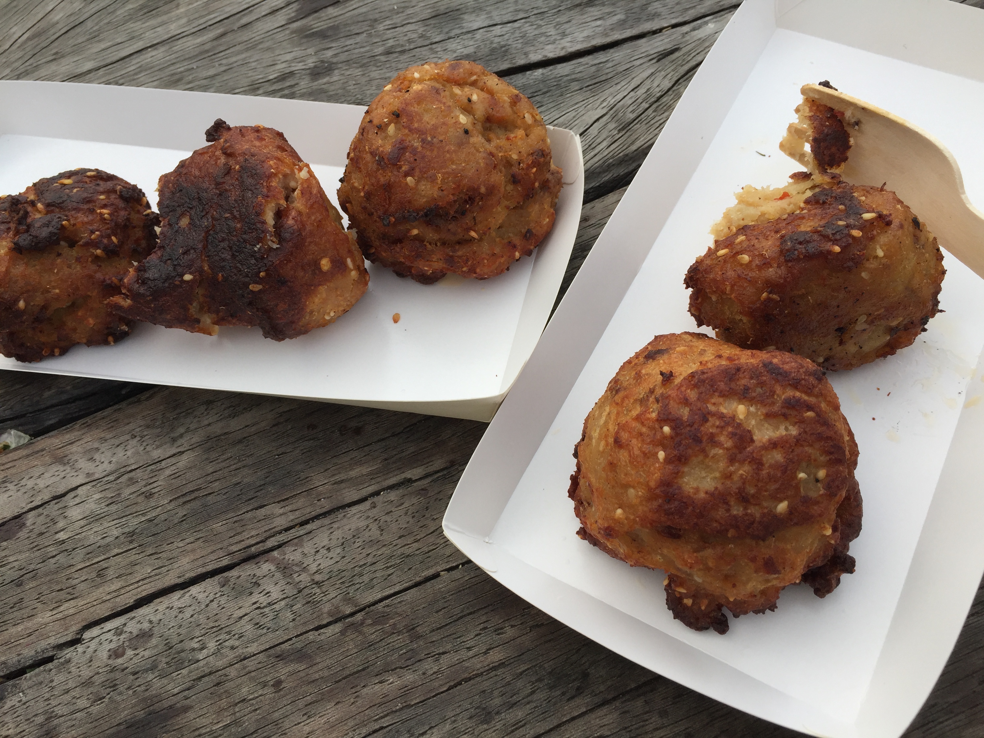 魚餅一個DKK15,五個DKK60,我們便決定原味和辣味都試一下。新鮮熱辣的魚餅比起放冷了的好吃太多了!一整球打碎的魚肉外層炸得微焦,十分香口。裡面的魚肉混和了香草調味,尤其辣味的更加出眾,而且是真的有辣味,不像很多白人國家所謂辣的食物永遠也不辣。不過再一次提醒,丹麥的魚餅不是我們亞洲人想像中魚肉打得起膠彈牙的魚餅,而是咬下去裡面真的是魚肉碎的魚餅(相中叉開了一點可看到裡面的樣子)。如果嫌炸魚餅太乾,還可配搭沙律或aioli醬。