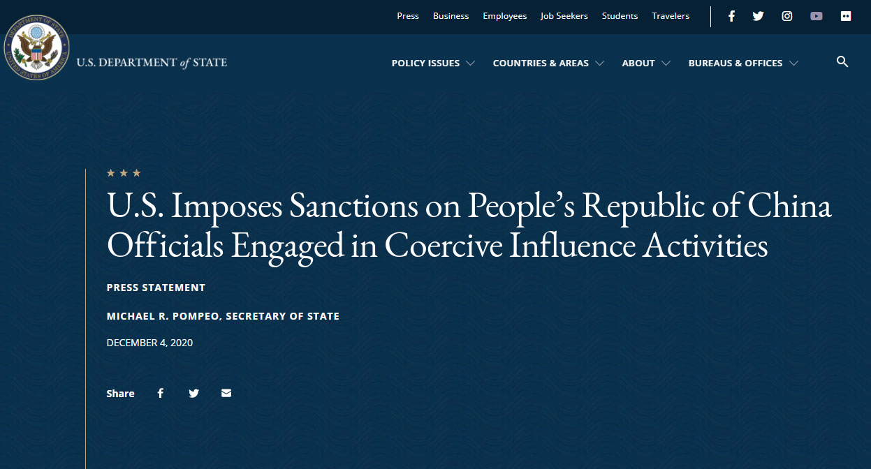 蓬佩奧表示,被制裁的人士曾經使用或威脅使用暴力、公開私人信息或其他脅迫手段,恐嚇不同政見人士的中國官員及其他相關人士,亦包括惡意干預美國國內政治事務、學術自由、個人私隱或商業活動的中共黨員。