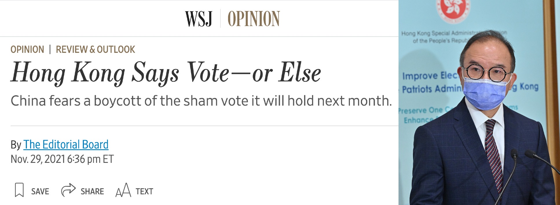 《華爾街日報》上月底刊出一篇評論文章,提到杯葛選舉及投白票,是港人表達政見的最後途徑之一。