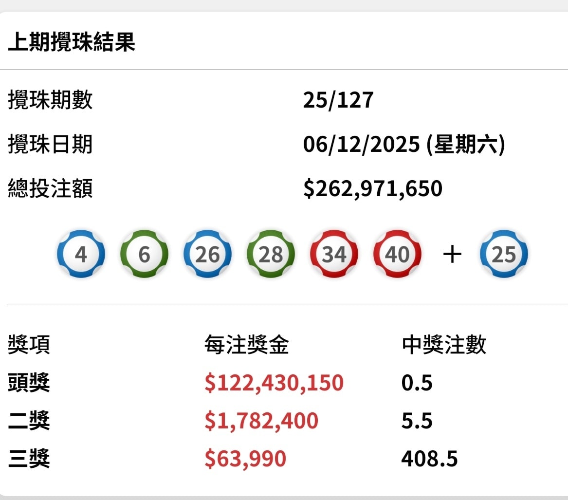 下期六合彩將於下周四(12月11日)攪珠,估計頭獎基金有8000萬。