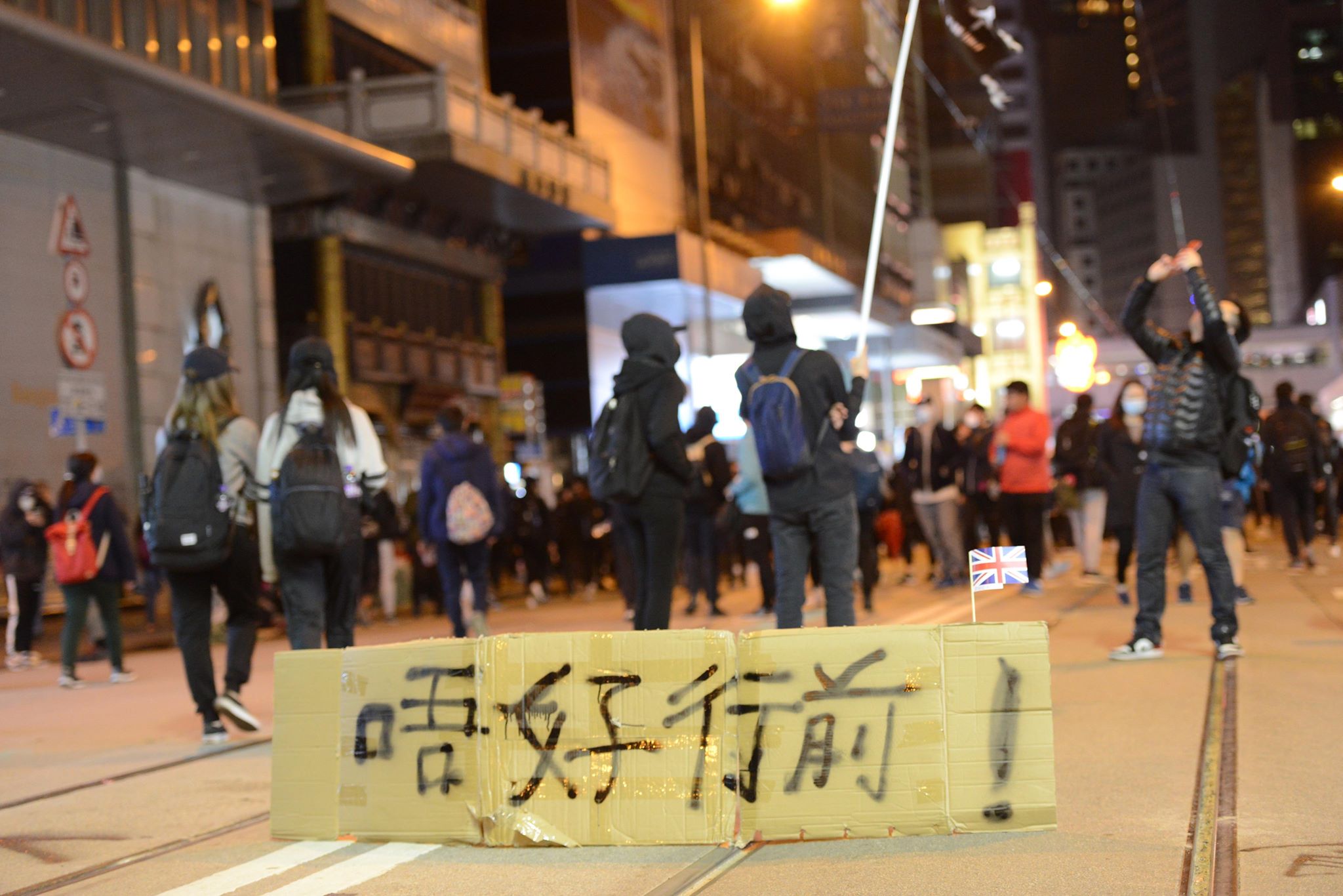 今日(12月8日)民陣舉行國際人權日遊行,由維多利亞公園出發,終點為中環遮打道行人專用區。遊行後並沒有經批准的集會在該處舉行,在終點附近,有遊行人士放了一個「唔好行前!」的紙牌,呼籲不要越過遊行路線。