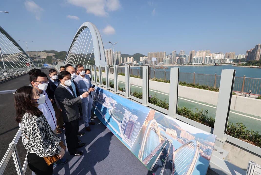 李家超登上了跨灣連接路的大橋,名為「活力無限」。橋上主跨兩個向外傾斜的橋拱設計,呈現出代表無限的數學符號「∞」,他表示,項目象徵香港首條同時具備行車道、單車徑及行人路的海上高架橋躍動將軍澳灣,帶來無限活力。他又說,政府會以「基建先行」及「創造容量」的規劃方式,繼續推動運輸基建項目,釋放沿線的發展潛力,並因應交通樽頸完善運輸網絡。
