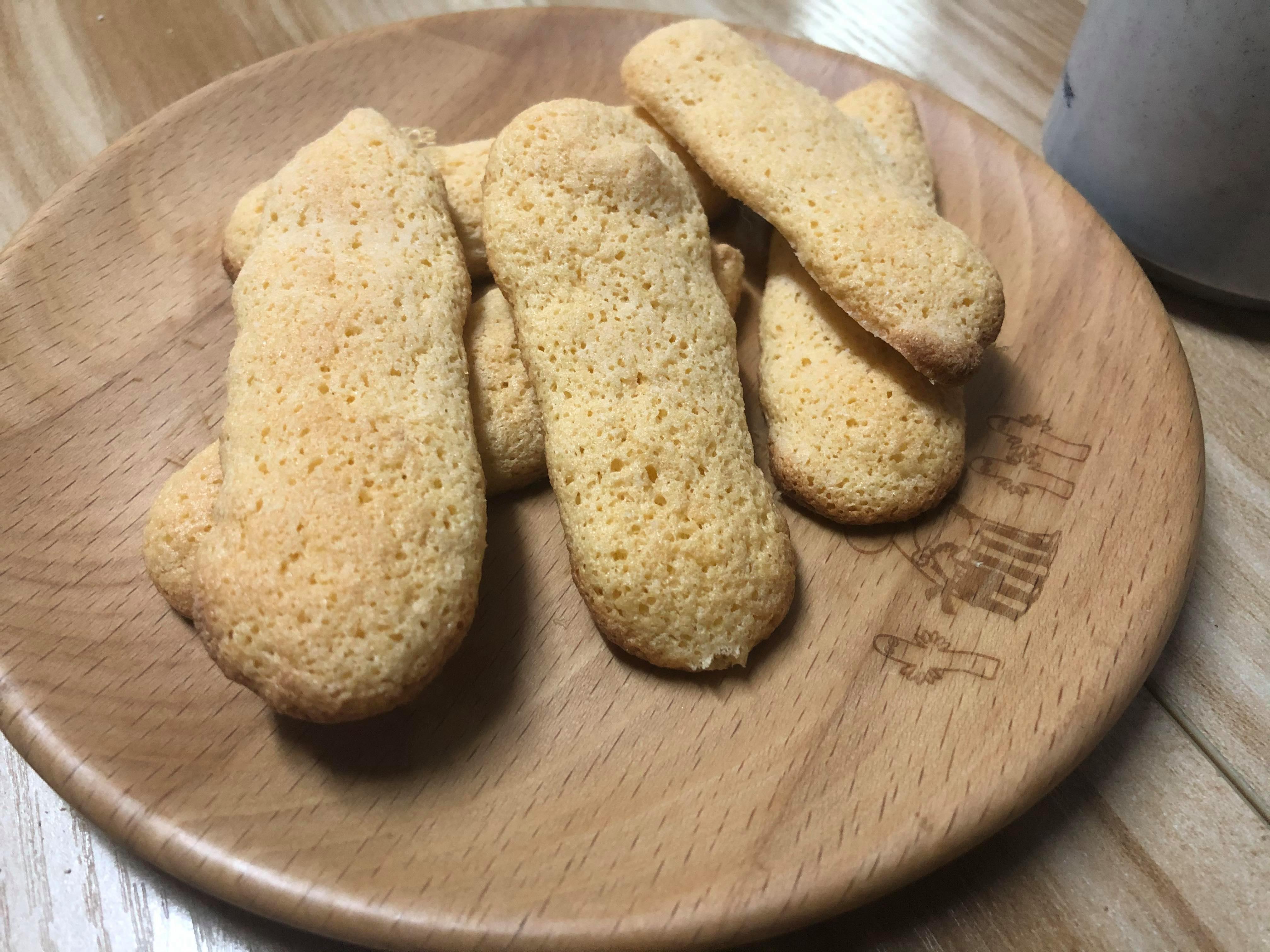 8. 糖霜過篩平均灑在手指餅麵糊上。