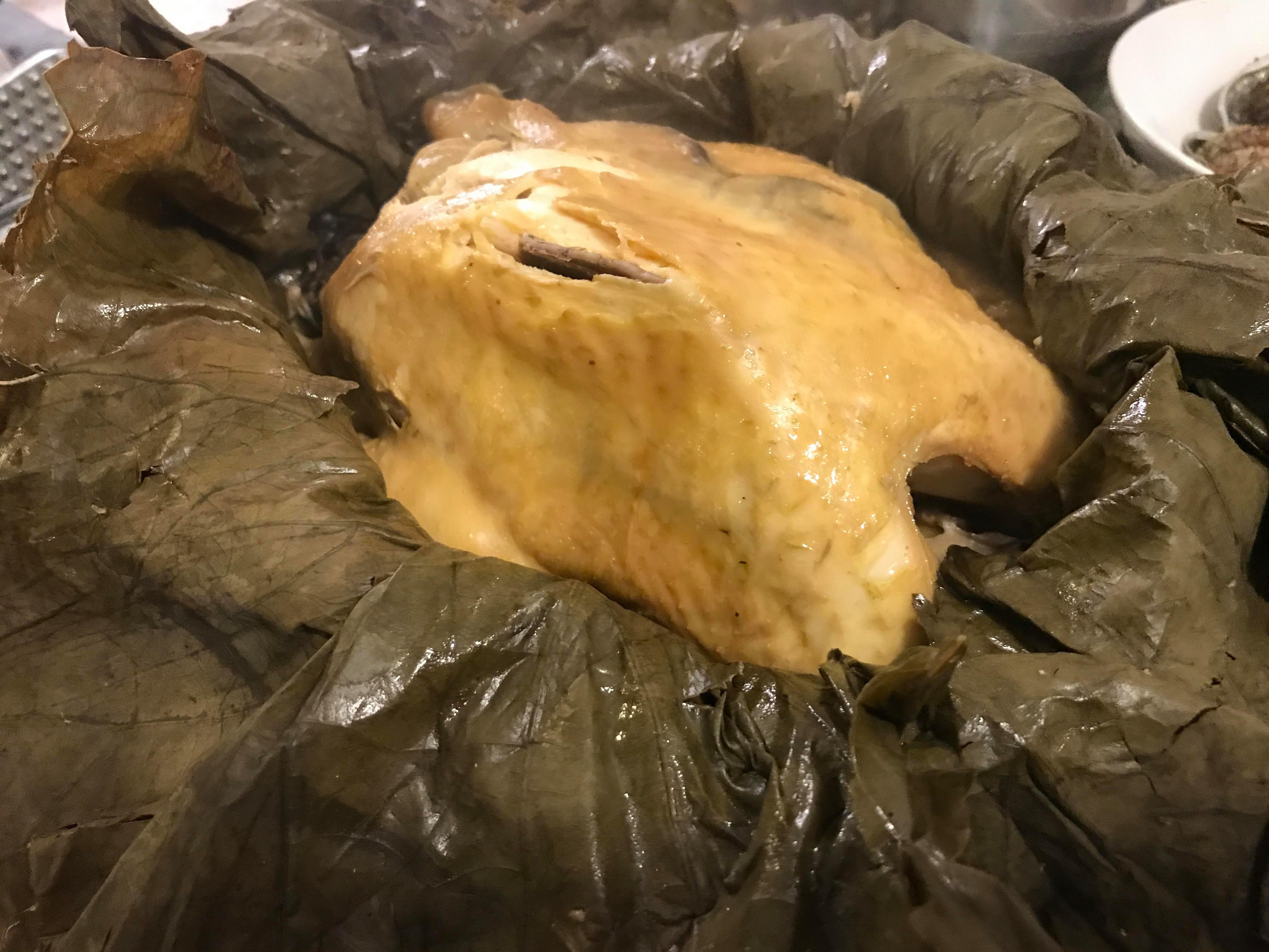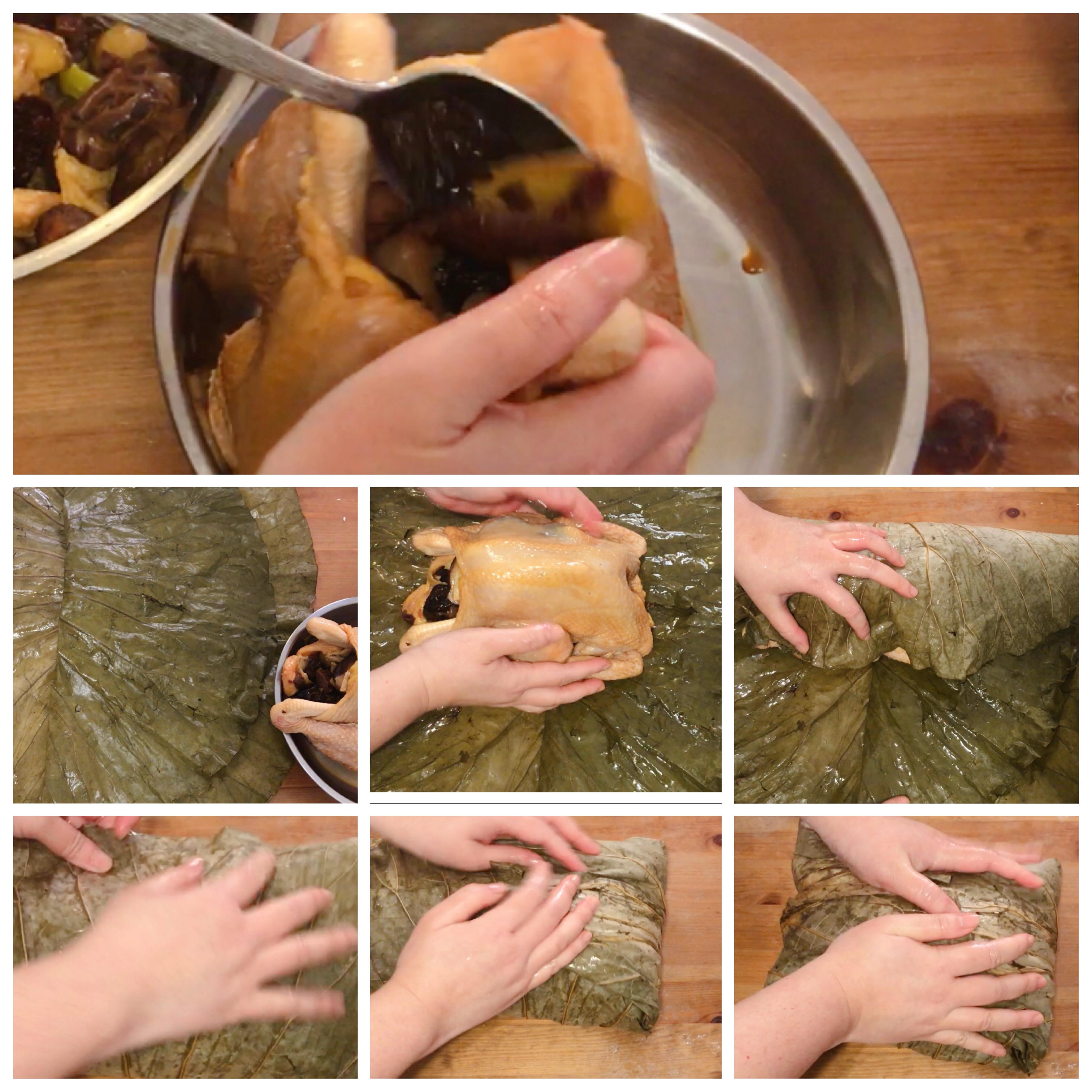 (5)將兩片荷葉攤平,在其上加入麻油,將雞胸朝上,然後先左右包雞再用上下包好雞,然後用錫紙包在荷葉上(拍片時沒有加錫紙但覺得包錫紙的話可以保留更多汁)。