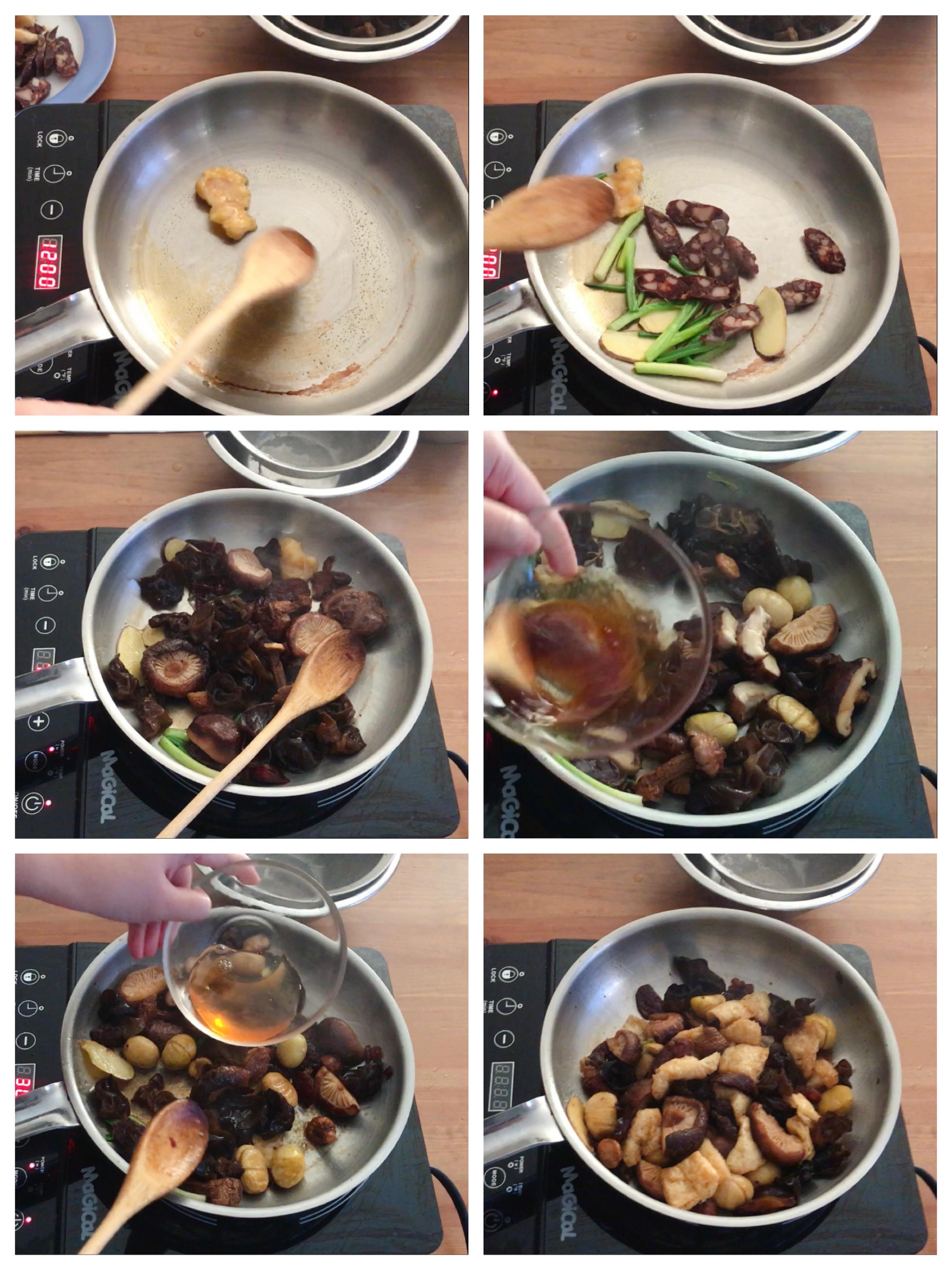 (4)在鑊中落油和之前在雞中找到的雞油一起爆炒,落薑/蔥/蒜和潤腸炒至香味出來,放入冬菇/雲耳/姬松茸,炒均一會加入內餡汁料,炒勻後加入腐皮和一些浸過菇的水,炒至汁收入食物內即可熄可,放置一陣,加麻油和元貝,即可釀入雞內。