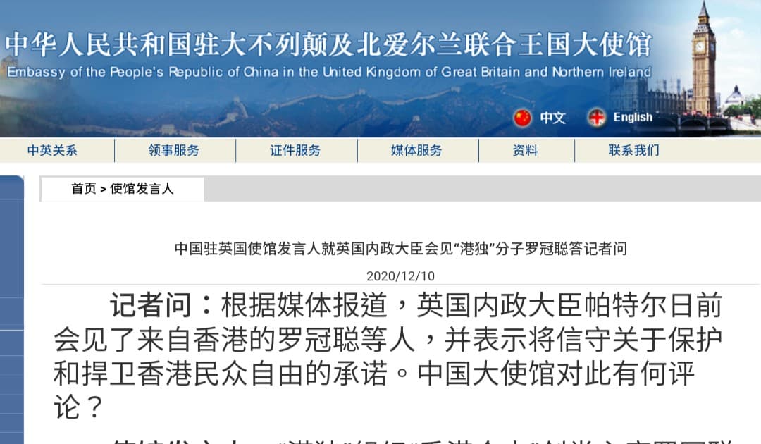 中國駐英大使館表示,羅冠聰涉嫌煽動分裂國家、勾結外國或境外勢力危害國家安全,正被香港警方通緝,彭黛玲堂而皇之會見中國警方通緝犯,明目張膽為「港獨」分子撐腰打氣,嚴重干涉中國內政和司法主權,嚴重違反國際法和國際關係基本準則,也完全違背英方不支持「港獨」的立場。